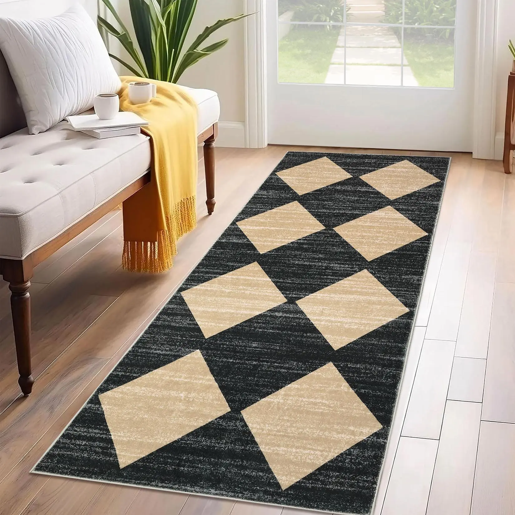 2 x 6 ft Polyester Black/Taupe Rectangular Laundry Bathroom Kitchen Modern Geometric Diamond Print Machine Washable Runner Rug-B