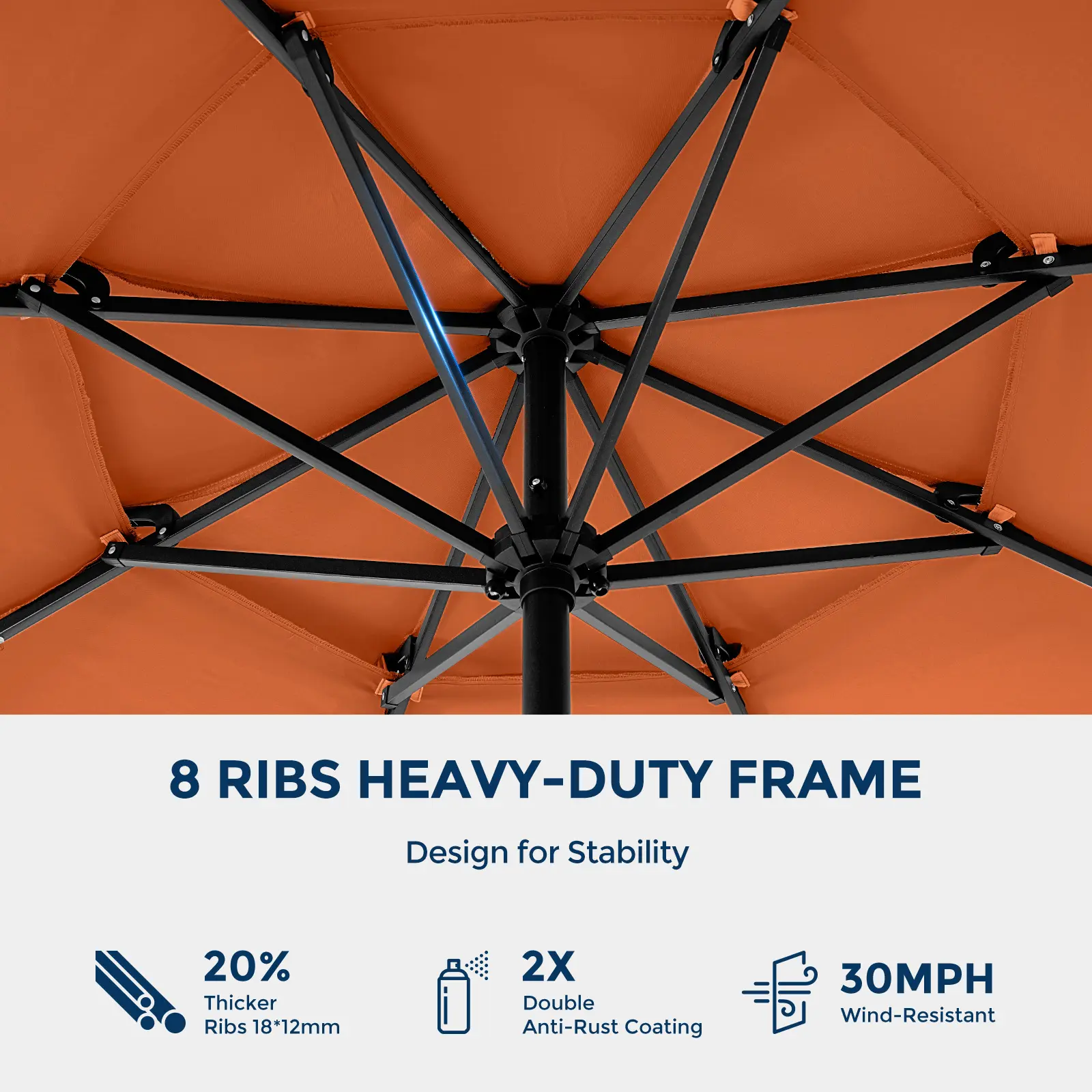 ·️ Heavy-Duty Frame – Durable 8-rib steel alloy frame with a 1.5-inch pole that fits all standard outdoor table apertures. 20% thicker ribs (12×18mm) deliver superior surface support and balance, reducing shaking and withstanding winds up to 30 MPH. Double powder-coated surface for excellent rust resistance.