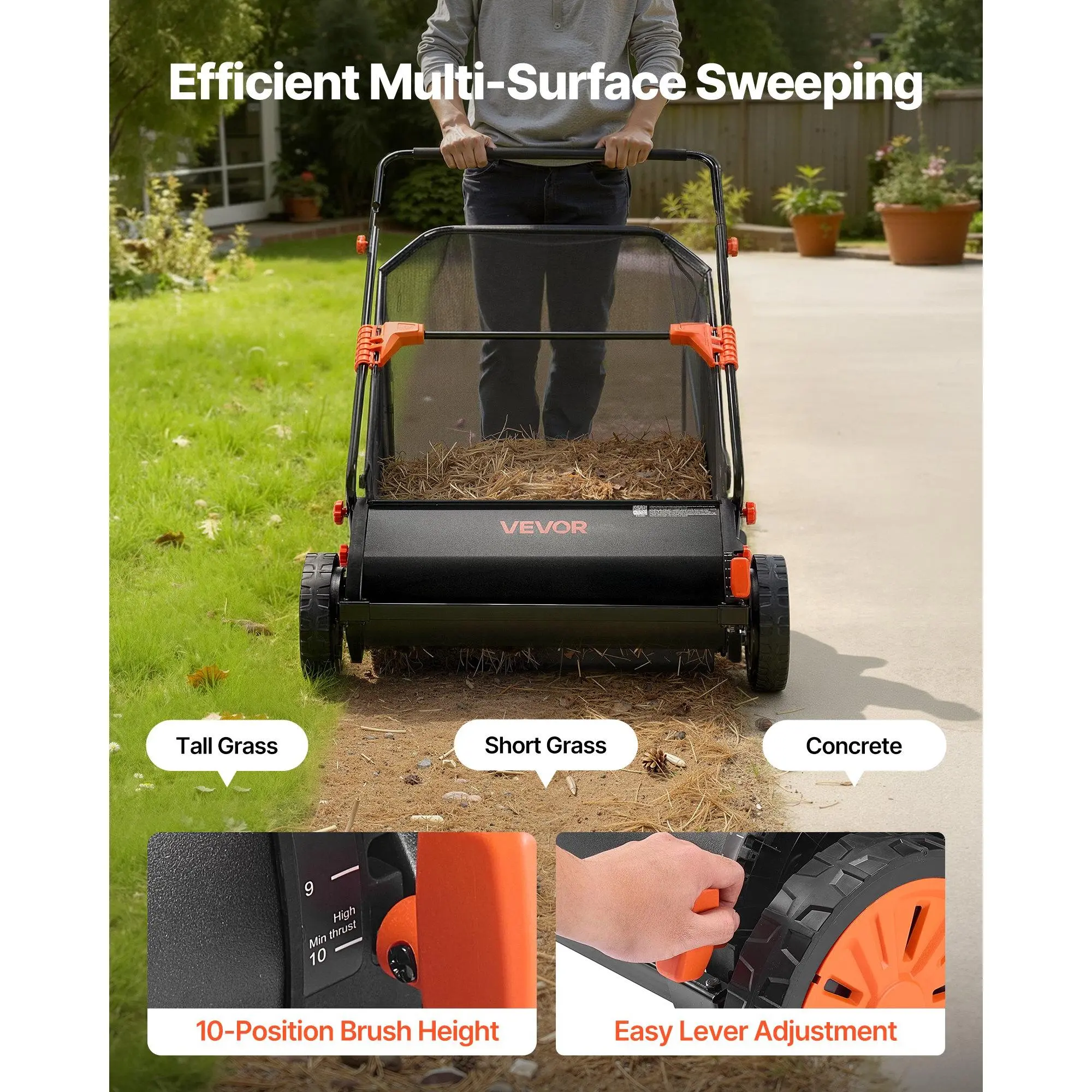 Effortless Lawn Cleanup: This lawn sweeper features a durable metal frame, 30 in sweep path, and a 1:5 brush-to-wheel ratio to collect grass clippings, leaves, pine needles in fewer passes on lawns, patios, driveways.Note: Wet leaves may reduce sweeping efficiency.Optional replacement brushes are available for hard nutsHigh-Efficient V-Shaped Brush: This push lawn sweeper comes with three V-shaped rotating brushes that reach deep into grass while reducing ground resistance.Durable PP bristles resist tangling from weeds and pine needles, saving time on brush maintenance10-Level Brush Height: The leaf and grass collector features 10-setting adjustable brush height for short/tall grass, uneven ground, and concrete surface.Side-mounted adjustment handle allows quick, precise control for flexible cleaning depthSmooth & Easy to Push: Our yard sweeper comes with upgraded PP and rubber wheels that provide smooth movement.The strong traction make it resist slipping on damp ground and wear-resistant design make it performs reliably on rough surfacesLarge-Capacity Hopper Bag: This garden sweeper includes a tear-resistant 12 cu.ft.hopper bag, reducing emptying frequency.Four-point quick-release buckles make dumping easy, while the foam-padded handle minimizes fatigue.Core parts have been assembled.Simply attach frame and hopper for instant useVEVOR Push Lawn Sweeper, 30 in Leaf & Grass Collector with 12 cu. ft. Hopper Bag, Adjustable Brush Height & Spinning Brushes, Heavy Duty Yard Sweeper with Rubber Wheels for Leaves Grass Cleanup