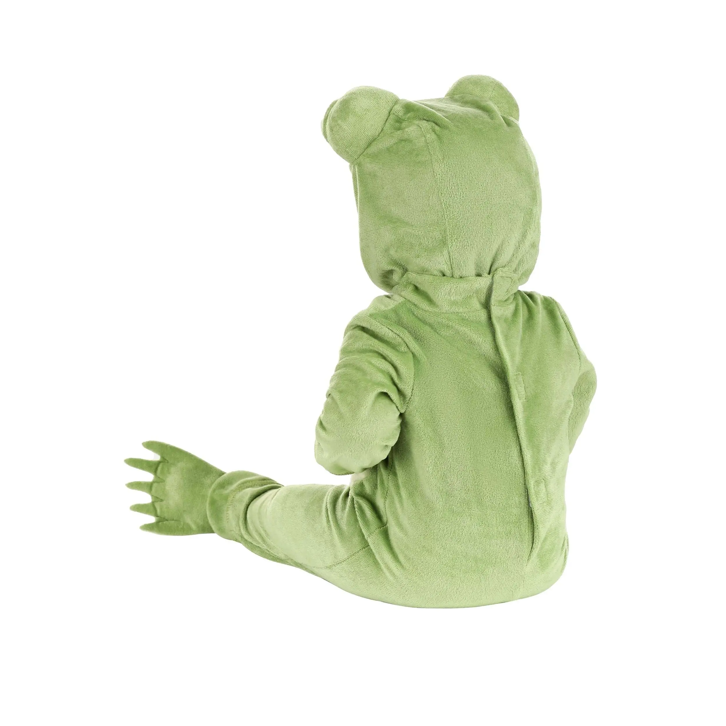 No enchanted royalty has ever looked as sweet as your little one will in this exclusive Deluxe Frog Costume for Infants! The green jumpsuit is made of soft and snuggly polyester velour. It fastens up the back and features snaps along the inseams for easy diaper changes. The belly is gently stuffed with fiberfill to give it a rounded appearance. Mitts and booties keep your frog's fingers and toes warm. The headpiece fastens under the chin and is sewn with soft-sculpted frog eyes.