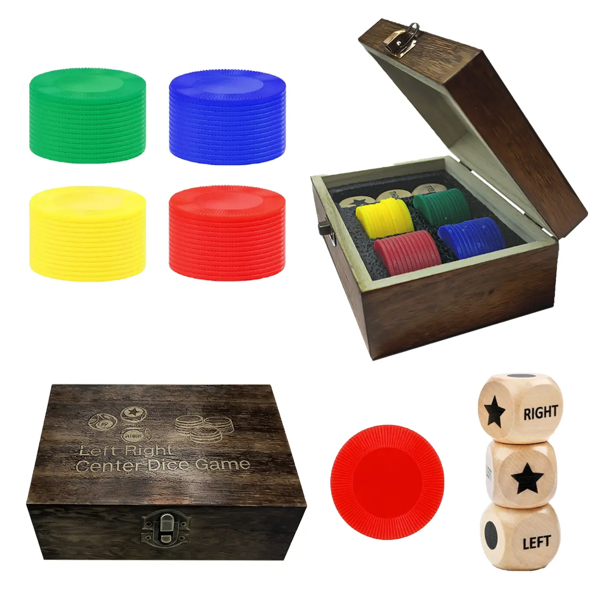 ·【Colorful Dice Chips】 Inside the set, you'll find three 1-inch wooden dices adorned with the fun left right roll theme, adding a touch of charm to your gaming experience. Additionally, the set includes 48 plastic chips in vibrant red, yellow, blue, and green colors, with 12 pieces of each color, providing ample resources for gameplay.