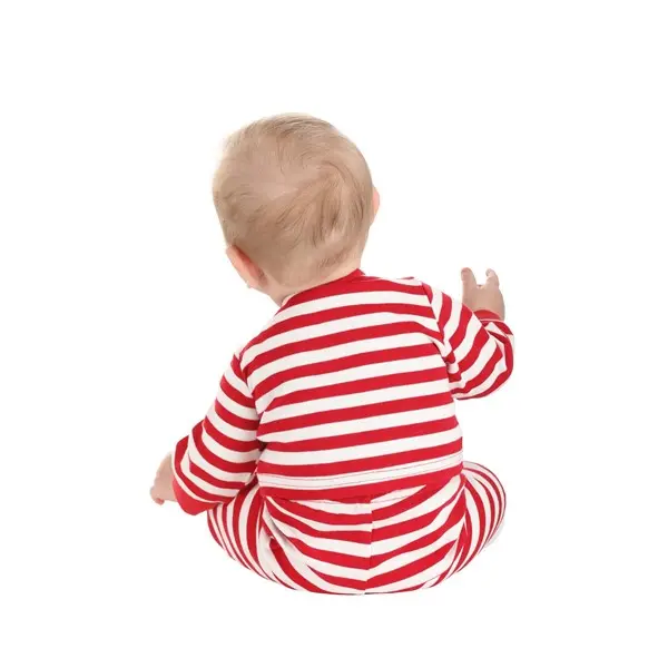 · Red and white striped pants have an elastic waistband and sewn on booties