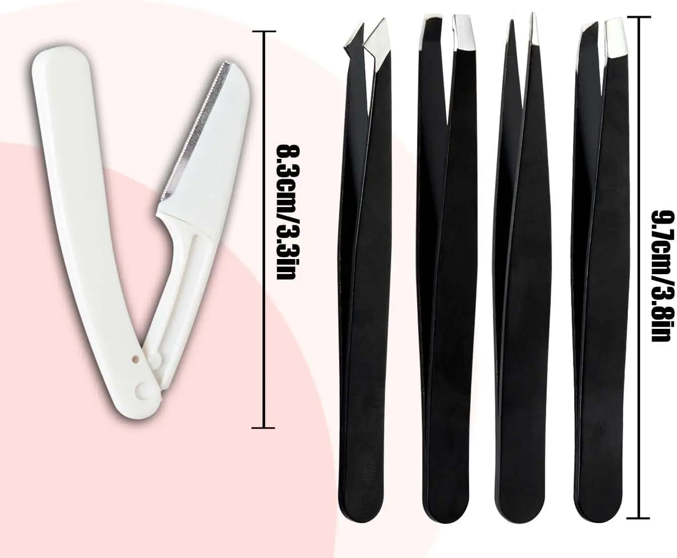 This set of tweezers is made of stainless steel and anti-skid coating. The head of the tweezers is perfectly aligned, and the hands do not slip. The handle of eyebrow razor is made of plastic and is lightweight, non-slip, and easy to hold