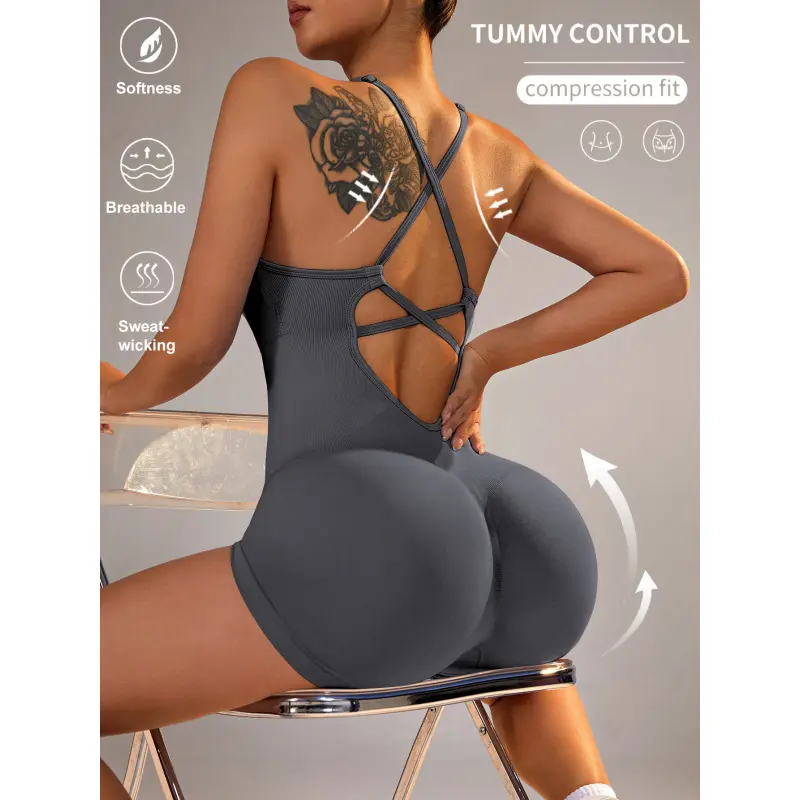 YEOREO One Piece Workout Jumpsuits for Women Backless Tummy Control Sleeveless Jumpsuits Lizvette V Back Scrunch Yoga Romper