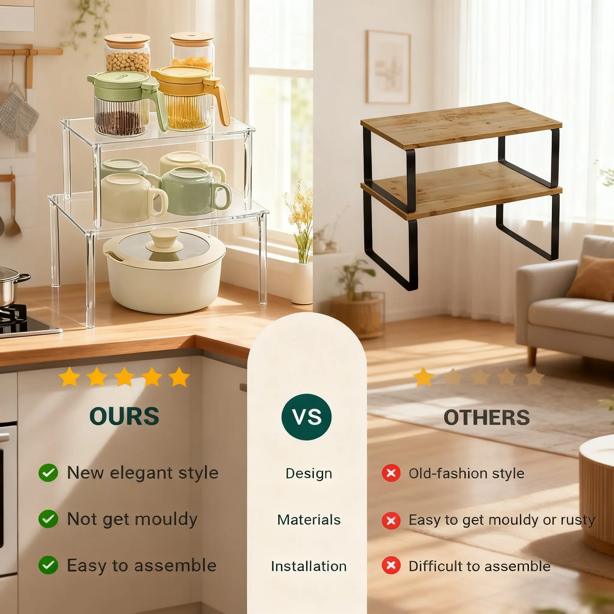 Transparent Acrylic Storage Rack, Layered Kitchen Organizer, Stackable Shelving for Cabinets, Desks, Countertops, Vertical Storage Solution