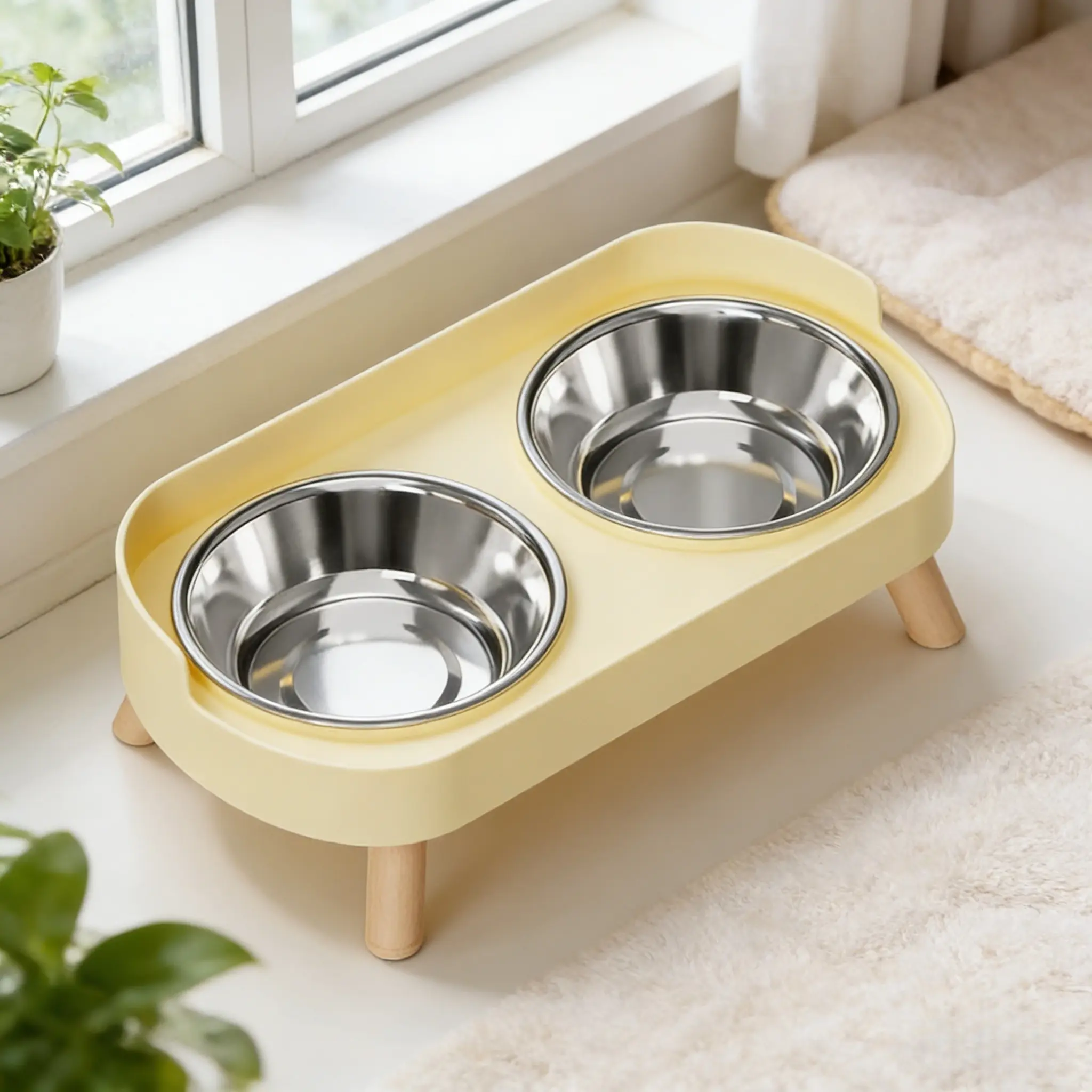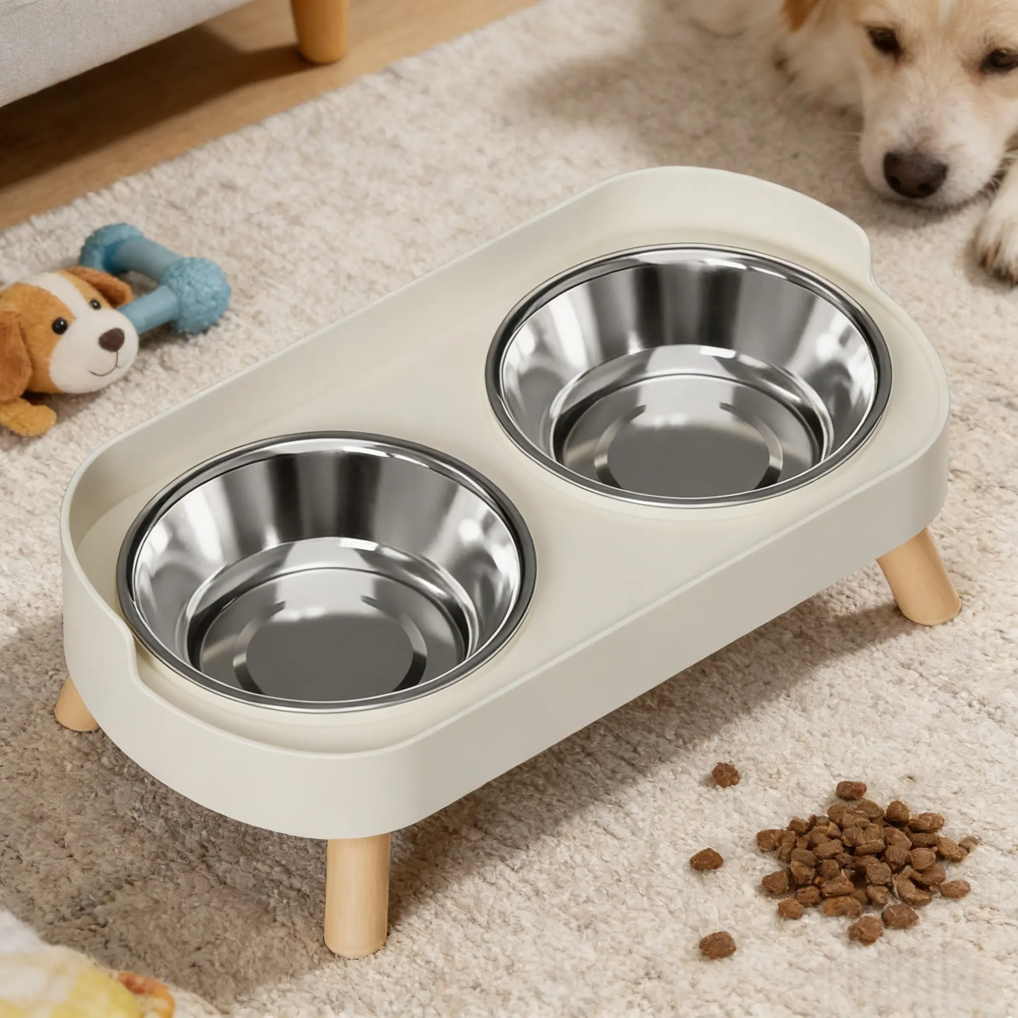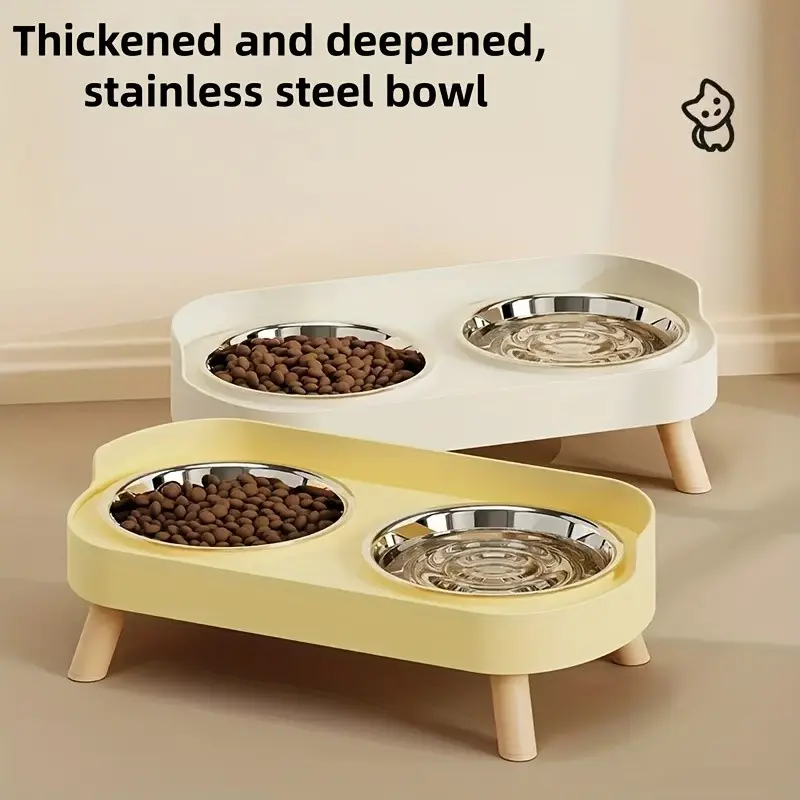 Pet Dual Bowl Food Dish, Scientific Neck Protection Design, Anti-Spill Wide Base, Stainless Steel, Water Bowl Included, Essential Pet Accessory