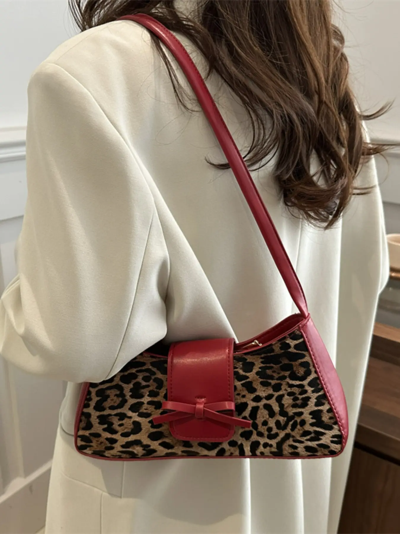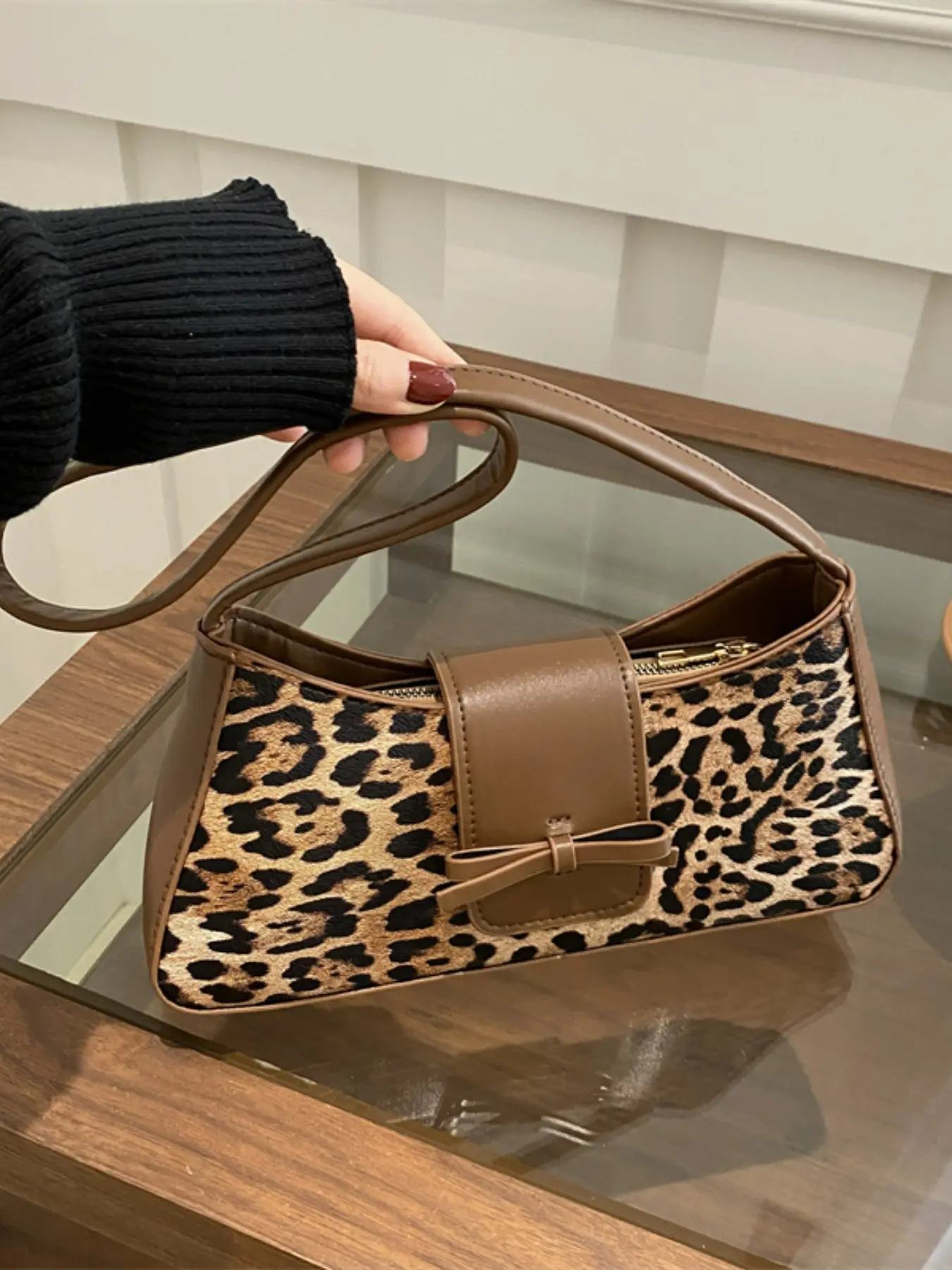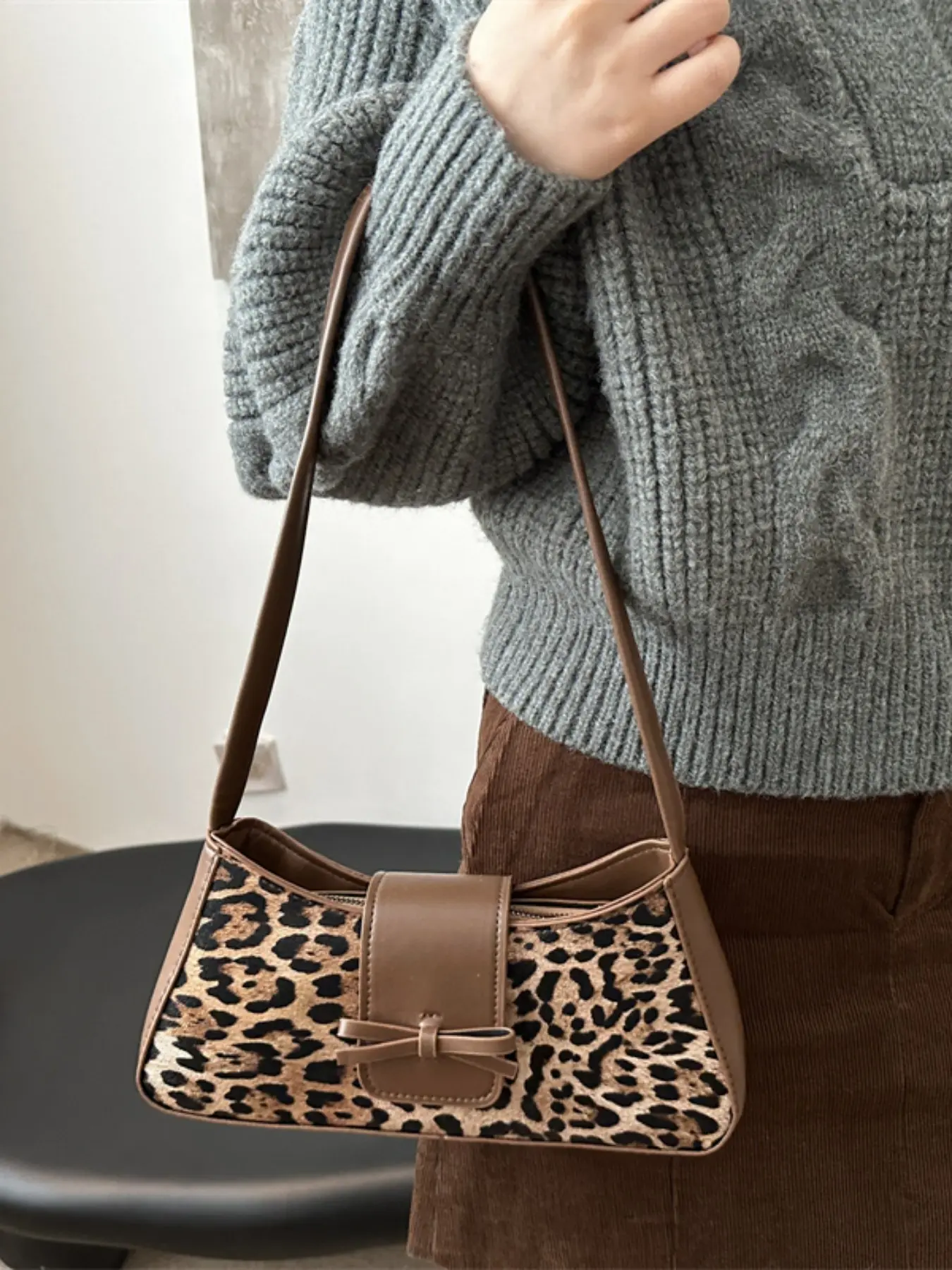 Leopard Print Fashion Trendy Bowknot Decorative Shoulder Bag, Stylish High-End Commuter Backpack, Unique Personality Design