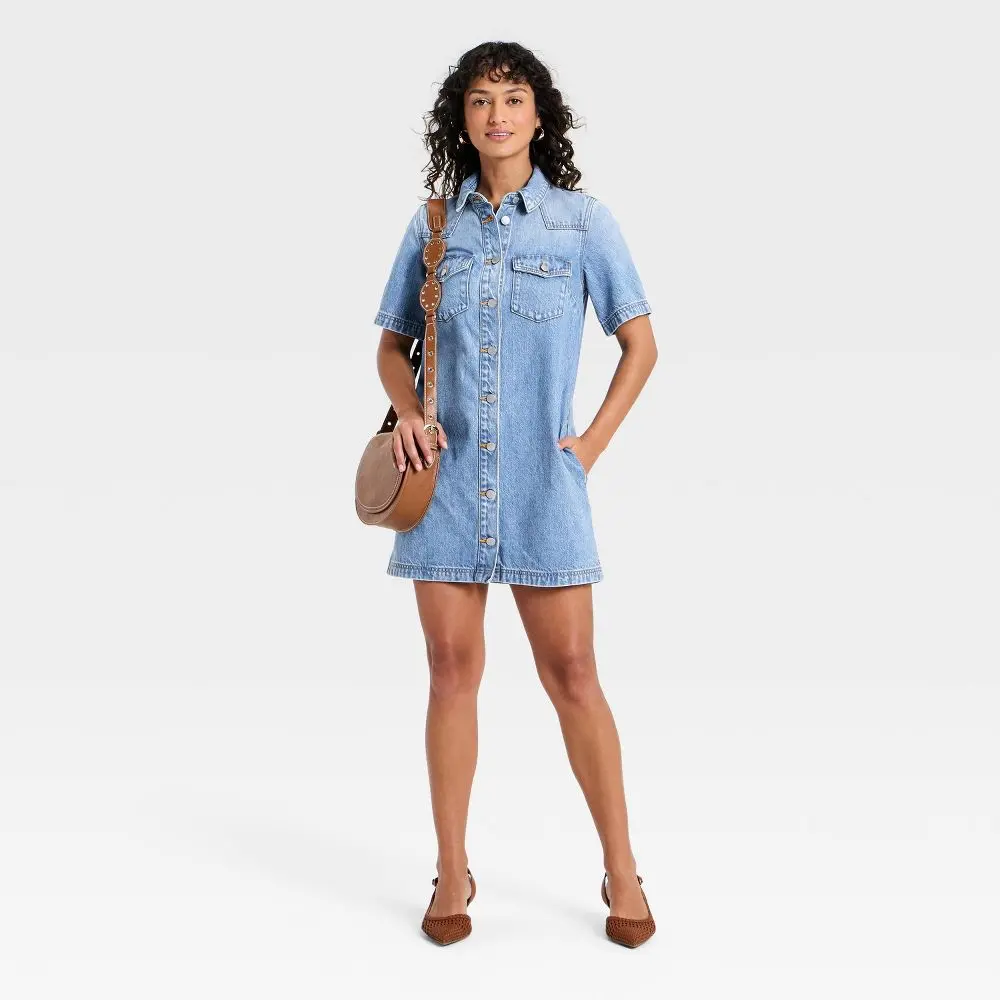 Bring effortless style and comfort to your wardrobe with this Short-Sleeve Denim Mini Shirtdress from Universal Thread. Fashioned in a mini-length, the short-sleeve shirtdress features a collared neckline, a full button-down front, and front and back yokes for classic style. Crafted from a mix of cotton, lyocell and recycled cotton fabric for comfortable wear, the shirtdress is detailed with front and side pockets to provide space for stashing on-the-go essentials.
