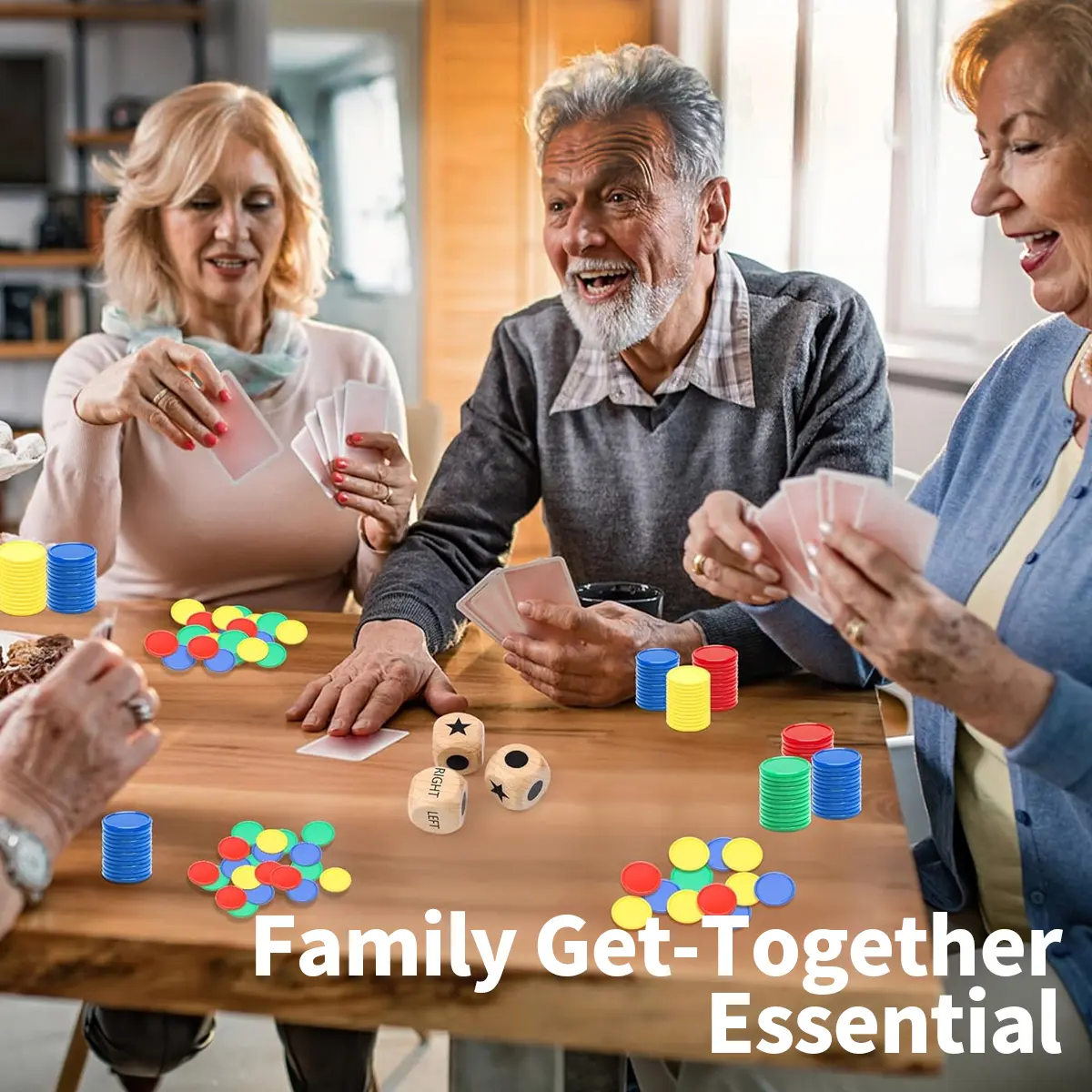 ·【Colorful Dice Chips】 Inside the set, you'll find three 1-inch wooden dices adorned with the fun left right roll theme, adding a touch of charm to your gaming experience. Additionally, the set includes 48 plastic chips in vibrant red, yellow, blue, and green colors, with 12 pieces of each color, providing ample resources for gameplay.