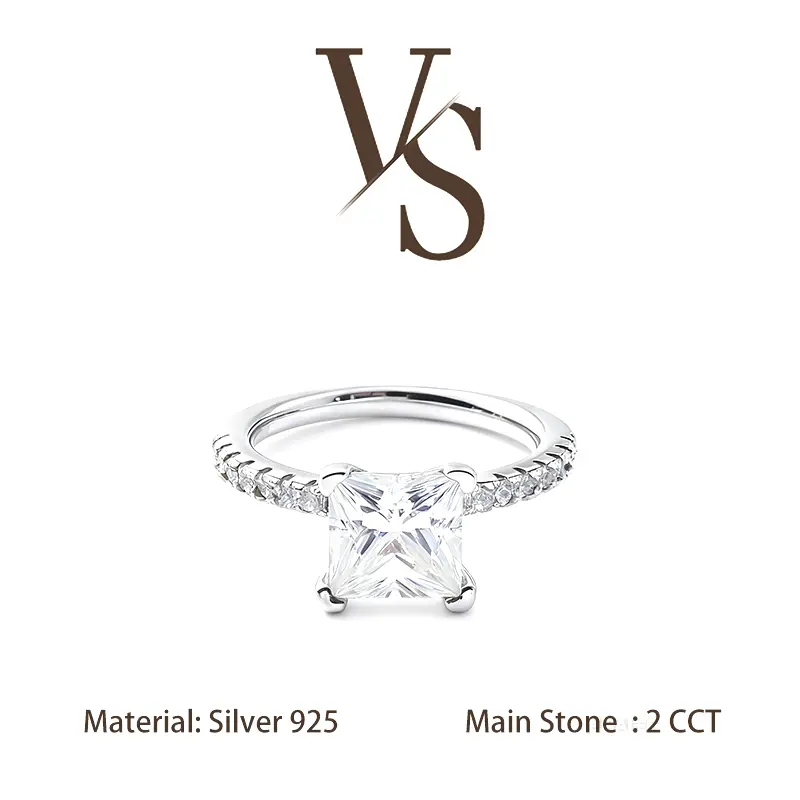 [Venus Jewelry] Synthetic Moissanite 2 CCT Princess Cut VVS 1 D Color Solid Silver 925 Solitare Ring