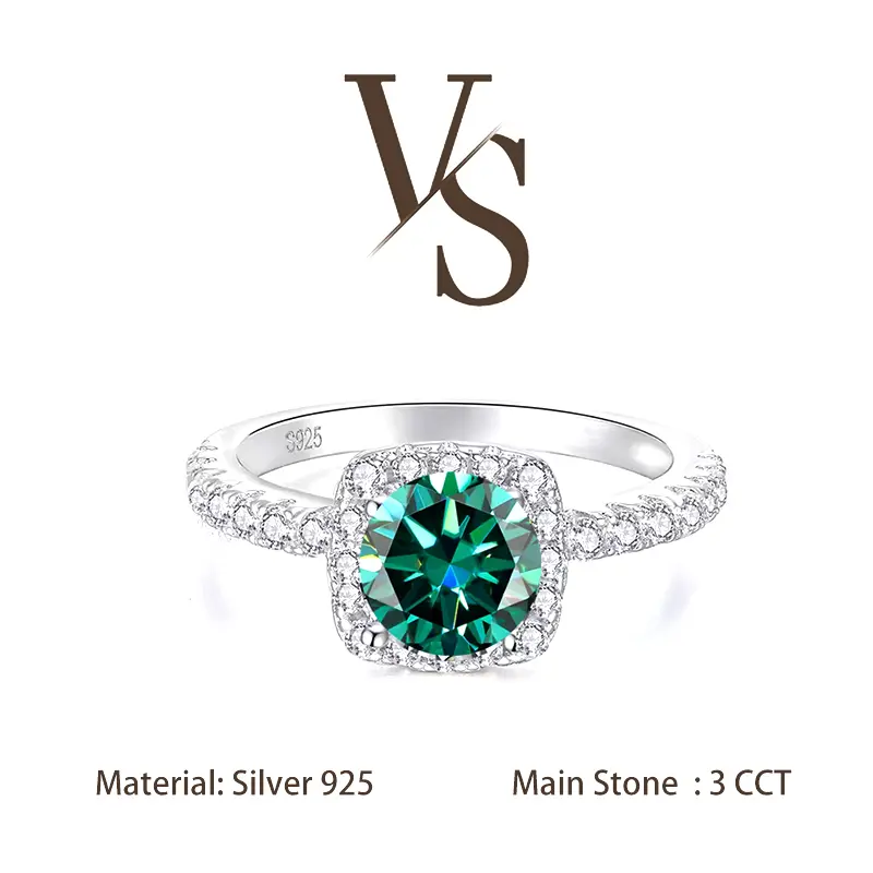 [Venus Jewelry] Synthetic Mossianite 3 CCT Green VVS 1 Solid SIlver Ring Square Halo 925 Silver Ring