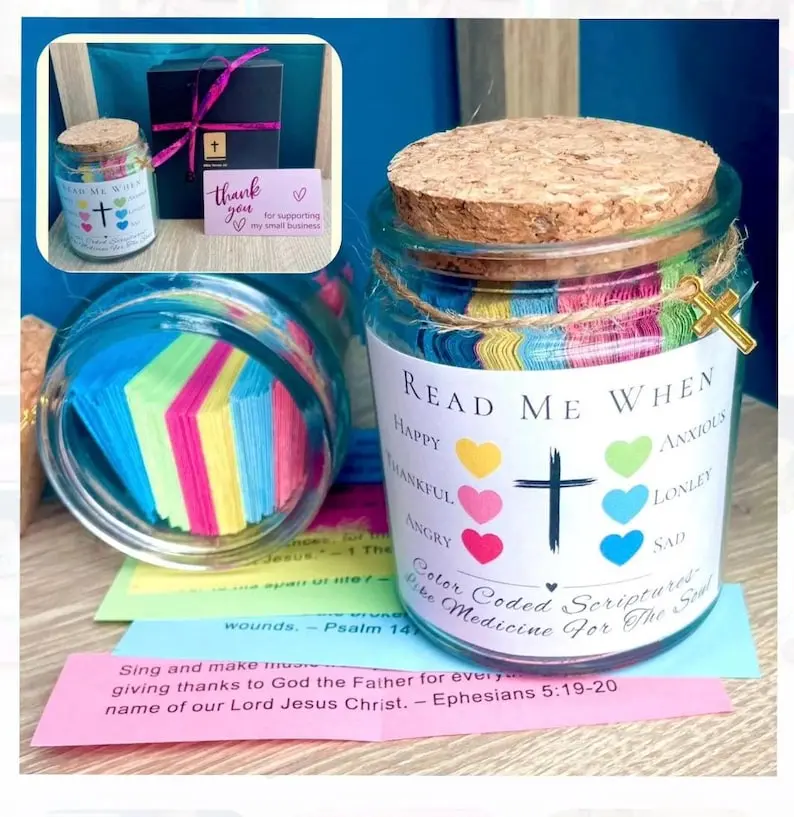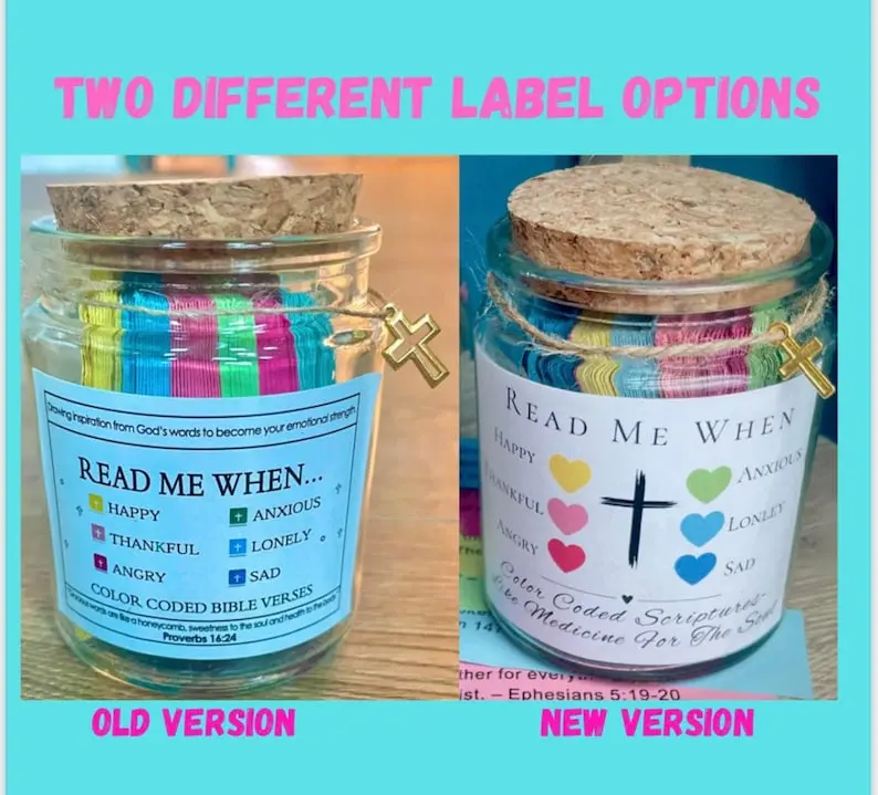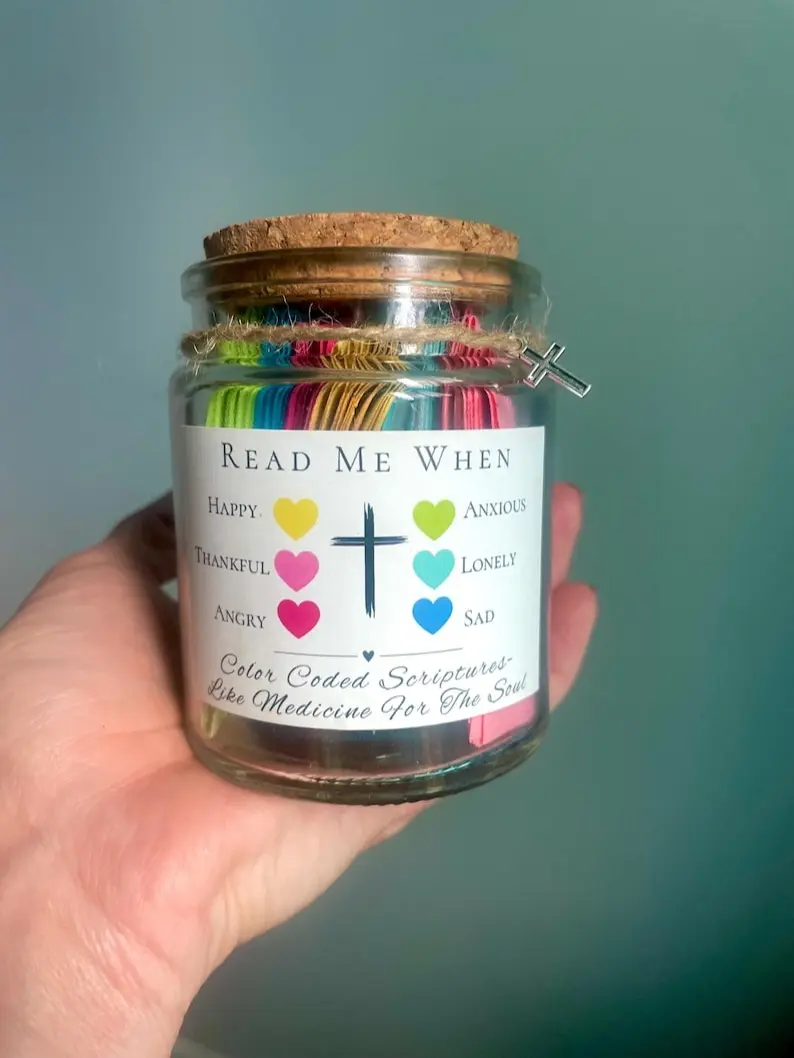 Color Coded Bible verse jar is hand made, each verse individually hand cut. A lot of time, love, and prayer go into making each one (if you have any prayer requests, please message me so I can pray while making your jar!)