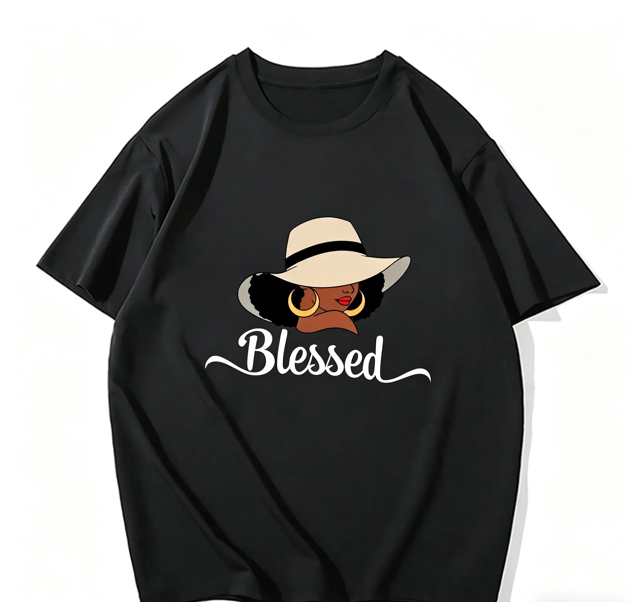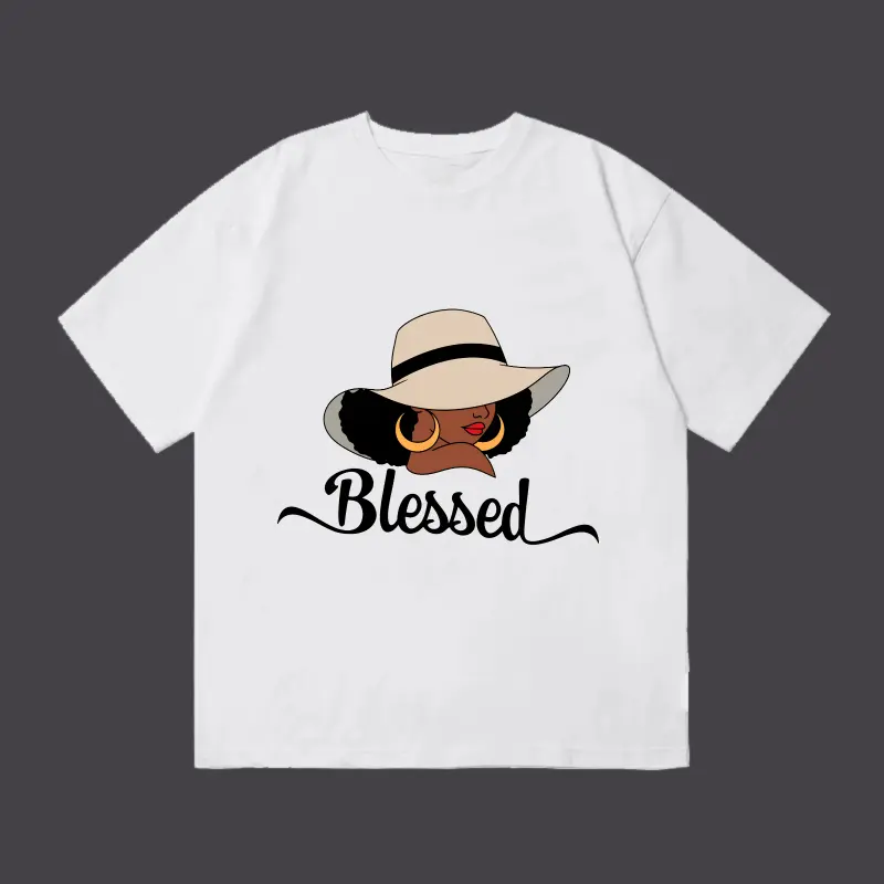 For the Black woman of faith, this elegant "Blessed" graphic tee is a beautiful celebration of grace, style, and divine favor. Featuring a stunning illustration of a Black woman with a wide-brim sun hat, gold hoop earrings, and bold curly hair, paired with the iconic faith slogan, printed on a premium soft cotton white tee, this oversized t-shirt blends spiritual inspiration with timeless style—perfect for church, everyday wear, or as a meaningful gift for sisters in Christ.