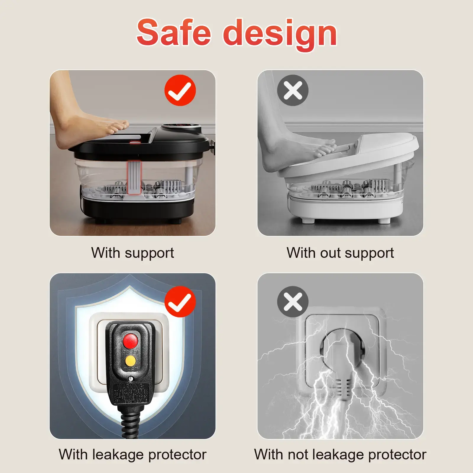 Foot baths always carry a lurking danger of electric leakage. The wet environment around the foot massage, combined with potential electrical malfunctions, can pose a serious threat to our well - being.Our foot spa bath with the innovative addition of a leakage protector, our baths are transformed into havens of safety. The moment it detects even the slightest irregularity in the current flow, which could indicate a potential leakage, it springs into action. In a fraction of a second, it cuts off the power supply, preventing any harmful electric shock from occurring.