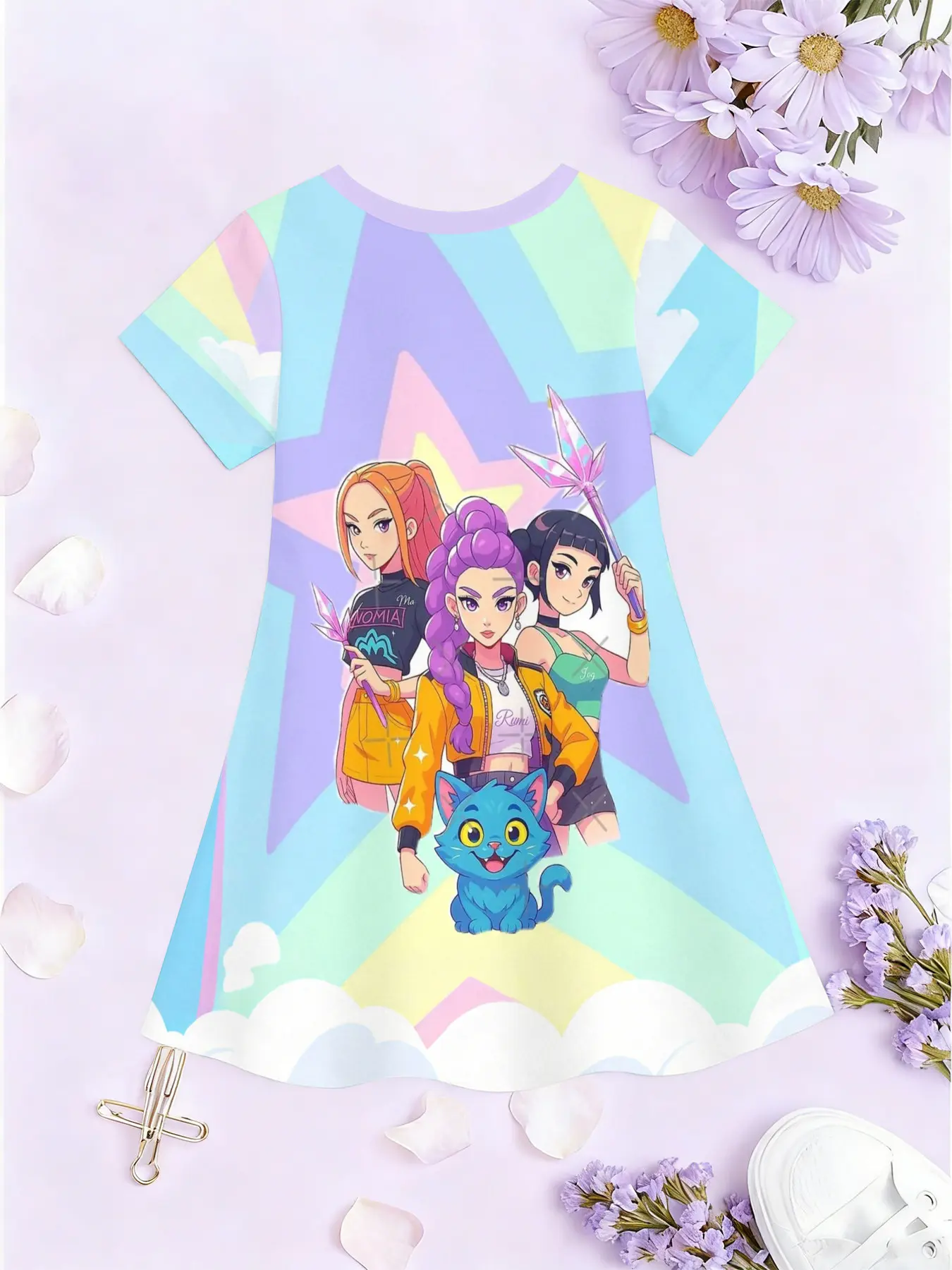 5. Girls' 3D Kpop Dress, Macaron Color Star Cloud Print A-Line Skirt, Perfect for Parties, Festive Gifts, Birthday Presents