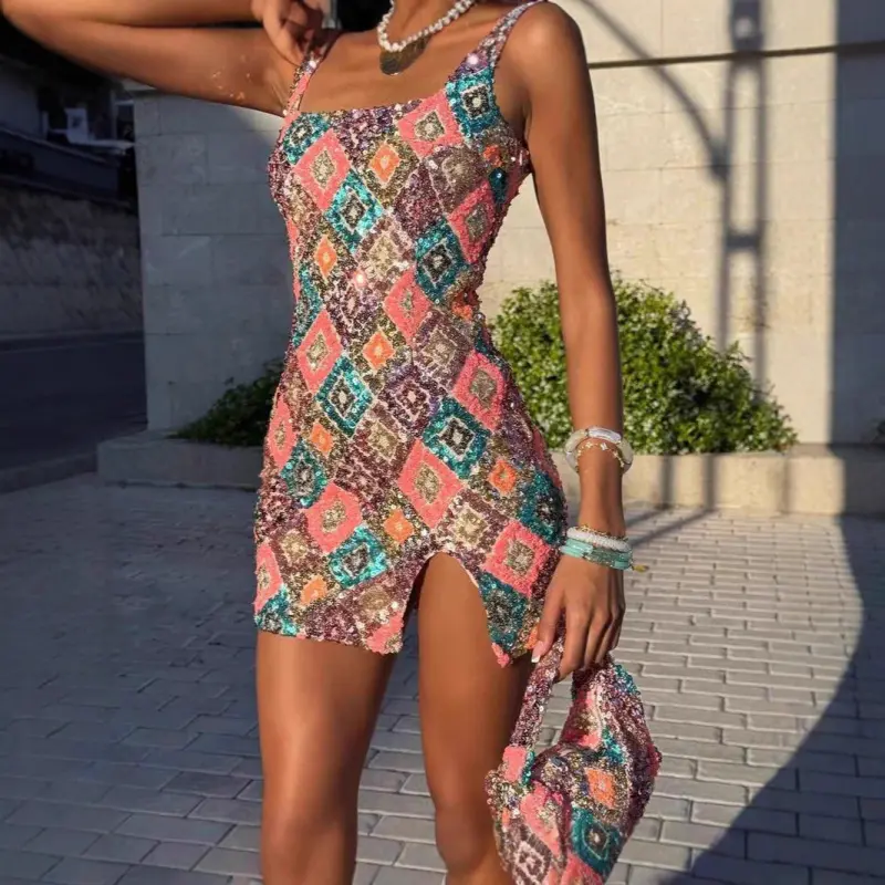 European and American Spring/Summer Fashion New Cross-Border Colorful Diamond Pattern Sequin Slit Bodycon Sexy Dress Wholesale