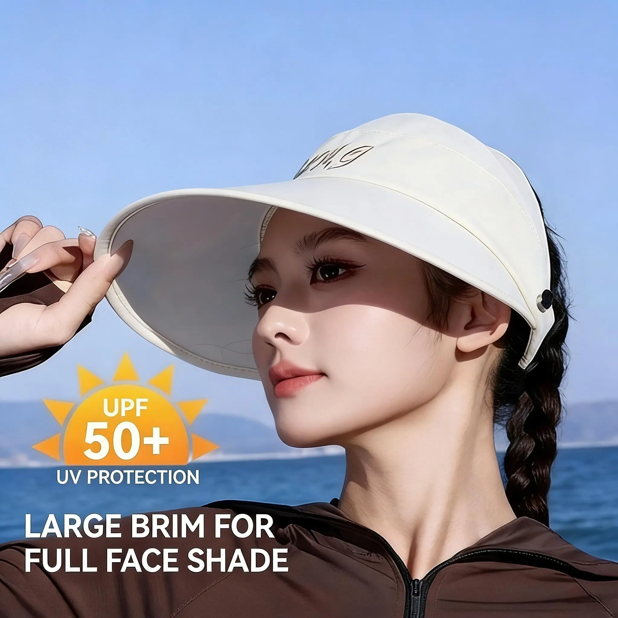 Wide-brim sun visor with UPF 50+ UV protection, open-top design for comfortable wearing. The adjustable head circumference fits most people, lightweight and breathable for outdoor daily use.