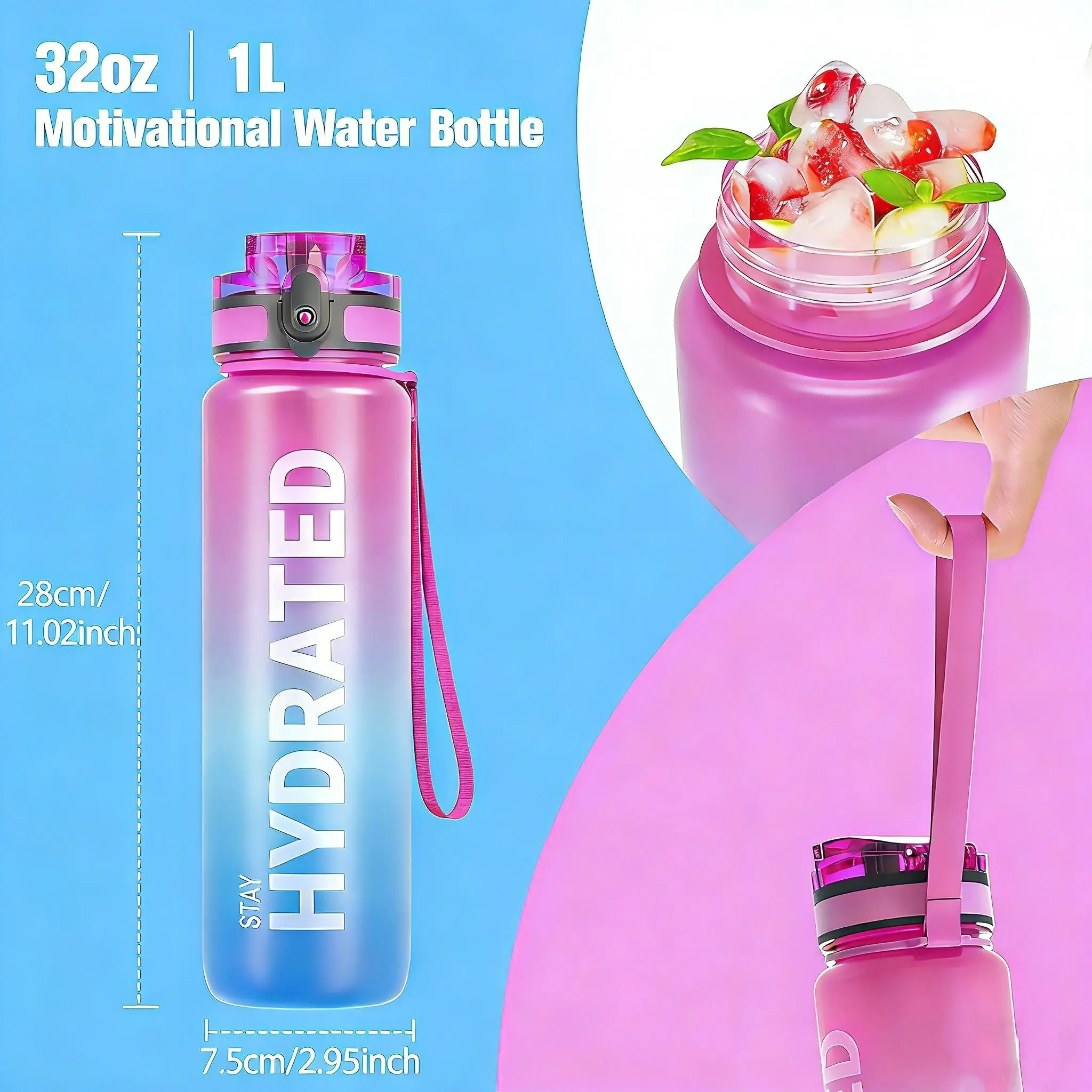 ·Stay Hydrated Throughout the Day: staying hydrated is often easier said than done. With the clear water bottle and its time reminder, you can now not only track your daily water intake at ease, but also encourage you to drink enough water. This water bottle holds 32oz / 1 Liter, which is the adequate amount to aid your daily hydration routine and it is light to carry (Without Straw).
