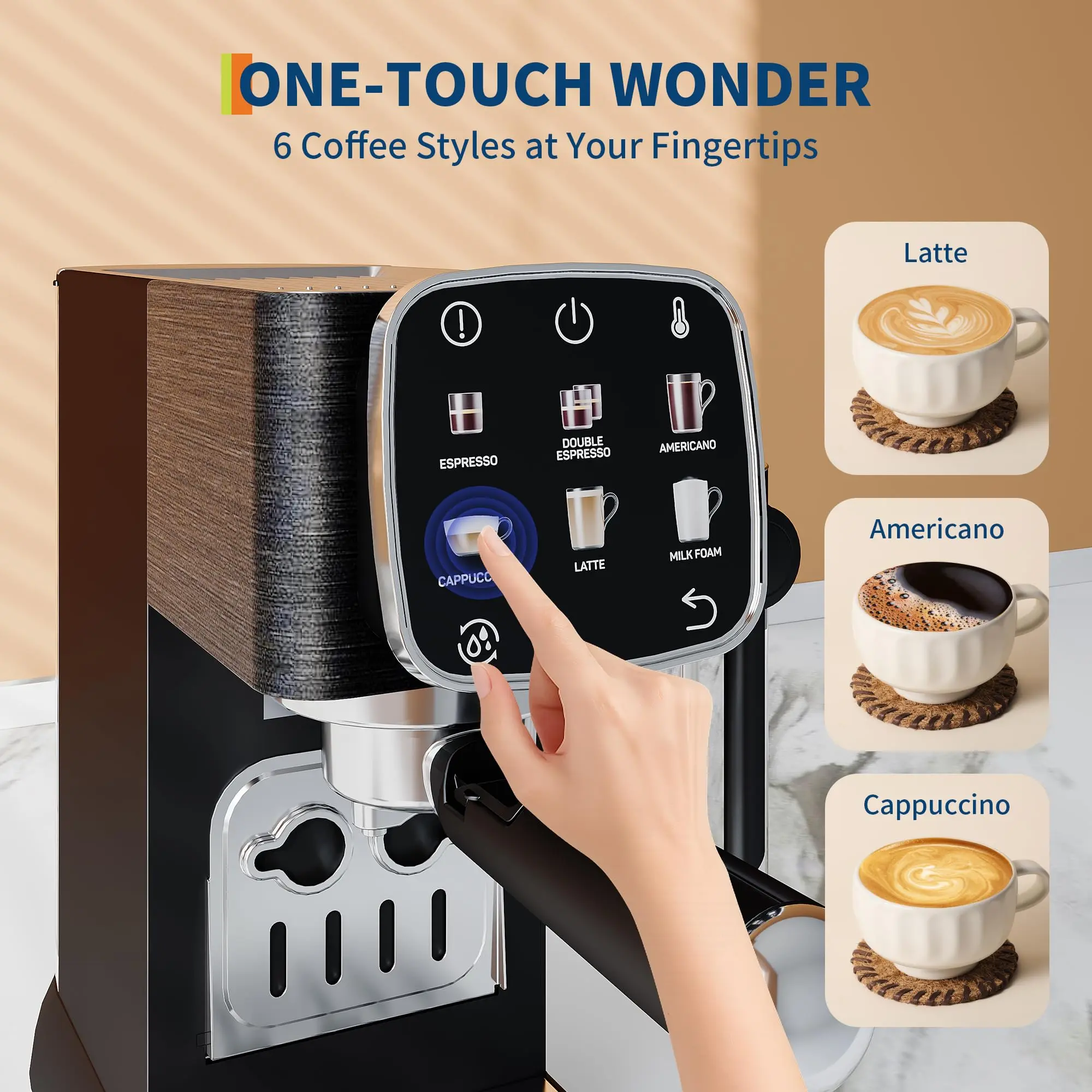 ·1.Intuitive color touchscreen lets you customize 8 drink presets, adjust strength and volume, and brew coffee, Americano, cappuccino, or latte with a single touch.