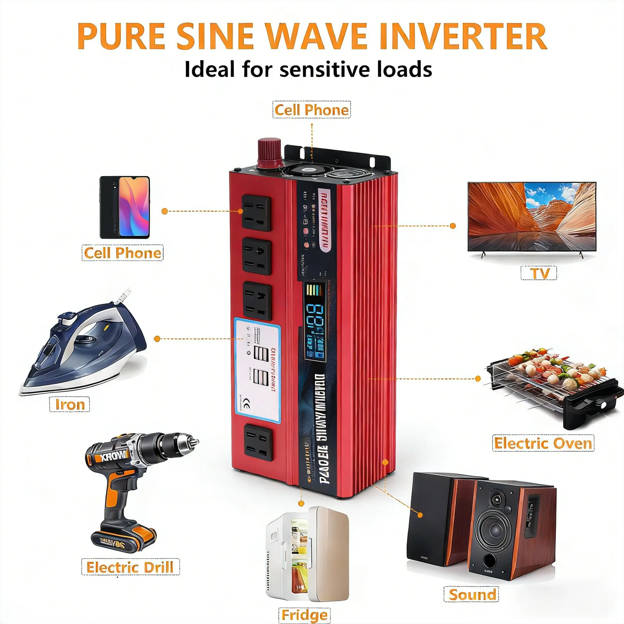 This inverter is perfect for RV, truck, boat, and camping. It provides reliable power for outdoor travel and emergencies. The 5000W peak power and 3 AC sockets make it a versatile choice. Charge devices with the 4 USB ports. Stay powered up anywhere.