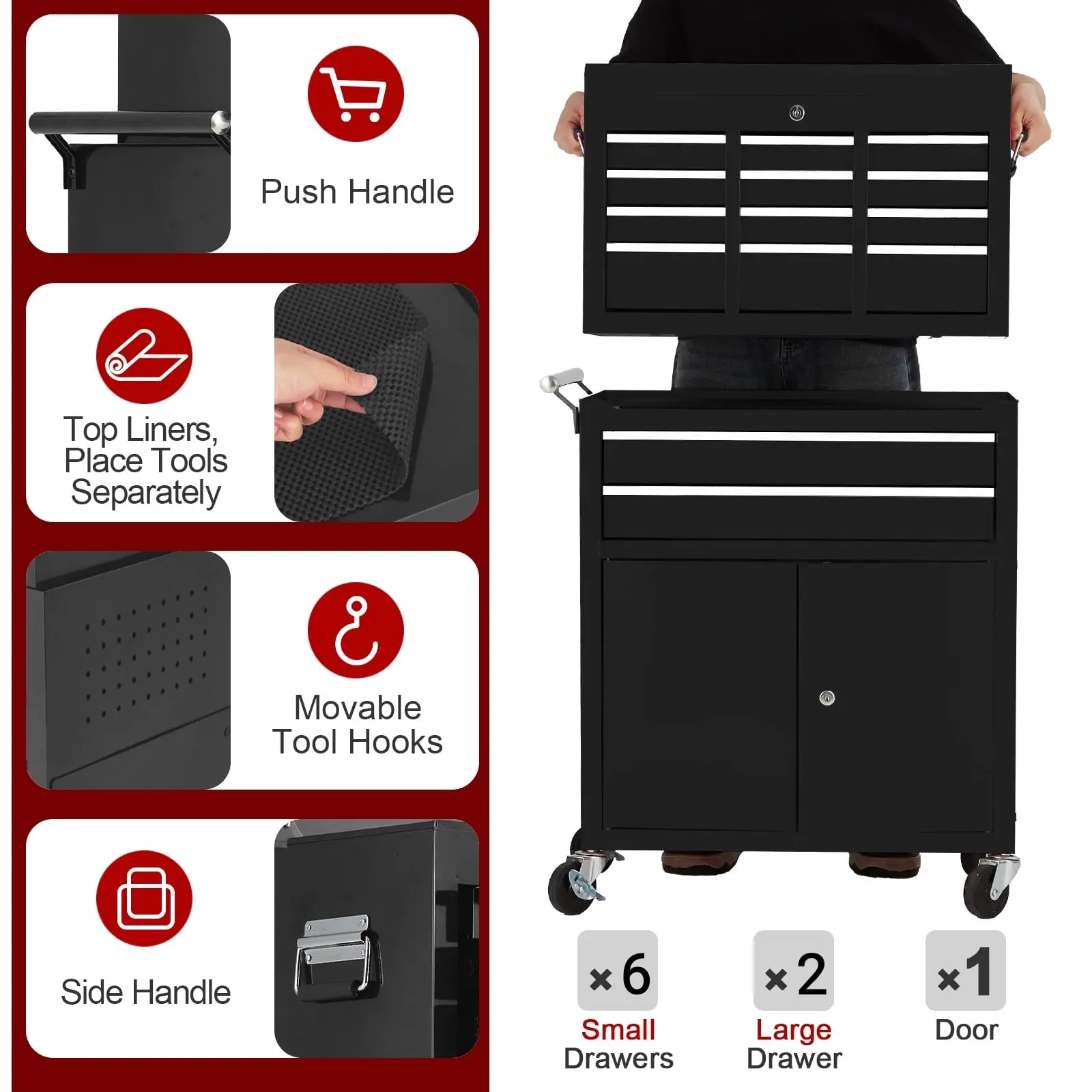 ·Innovative 2-in-1 design allows you to use the portable top tool box alone or stack it on the wheeled cabinet for flexible storage solutions.