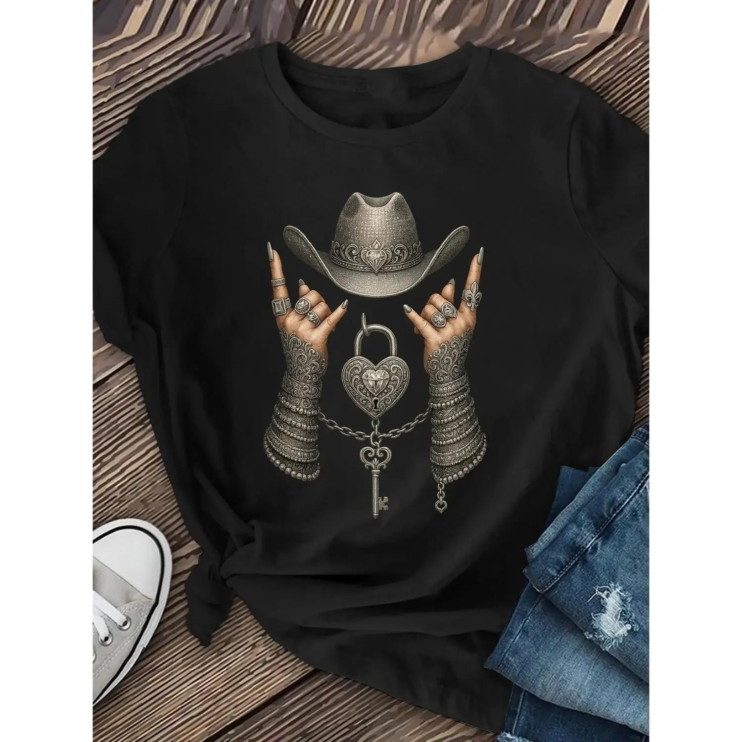 Women's Cowboy Graphic T-Shirt - Western Country Music Festival Tee - Maroon Shirt with Metallic Accents - Stretchy Casual Top for Everyday & Theme Parties - Machine Washable Round Neck Shirt