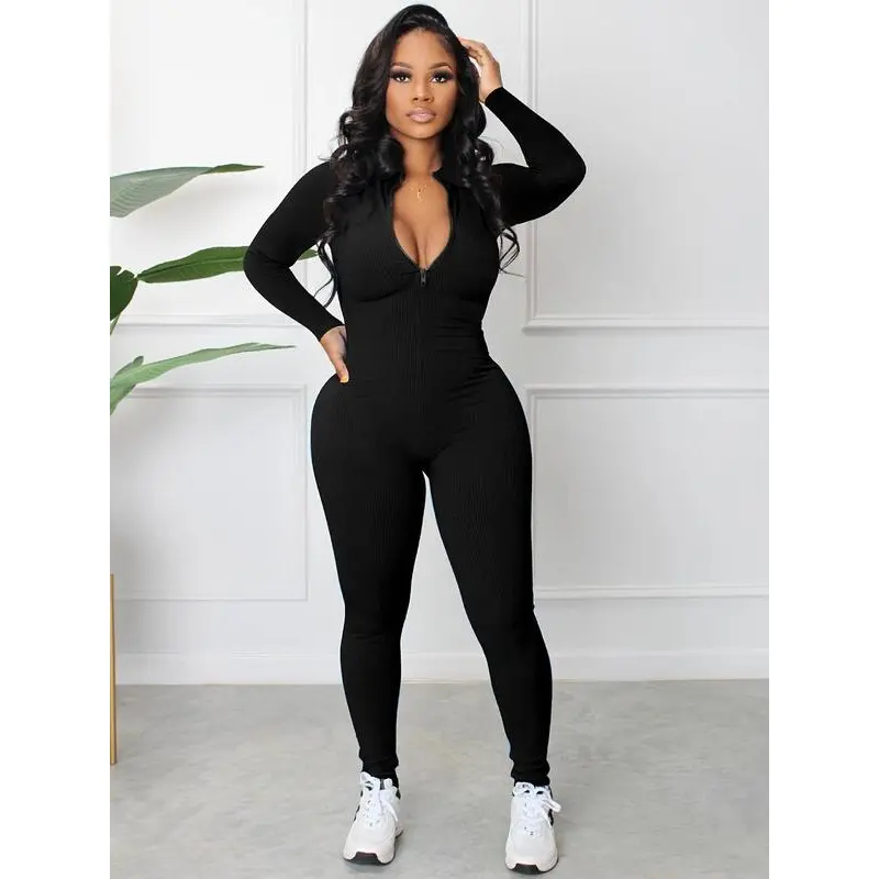 Women's Solid Textured Fitted Zip Up Jumpsuit, Jumpsuit for Women, Casual Long Sleeve Round Neck Skinny Jumpsuit for Spring & Fall, Women's Clothes for Daily Wear