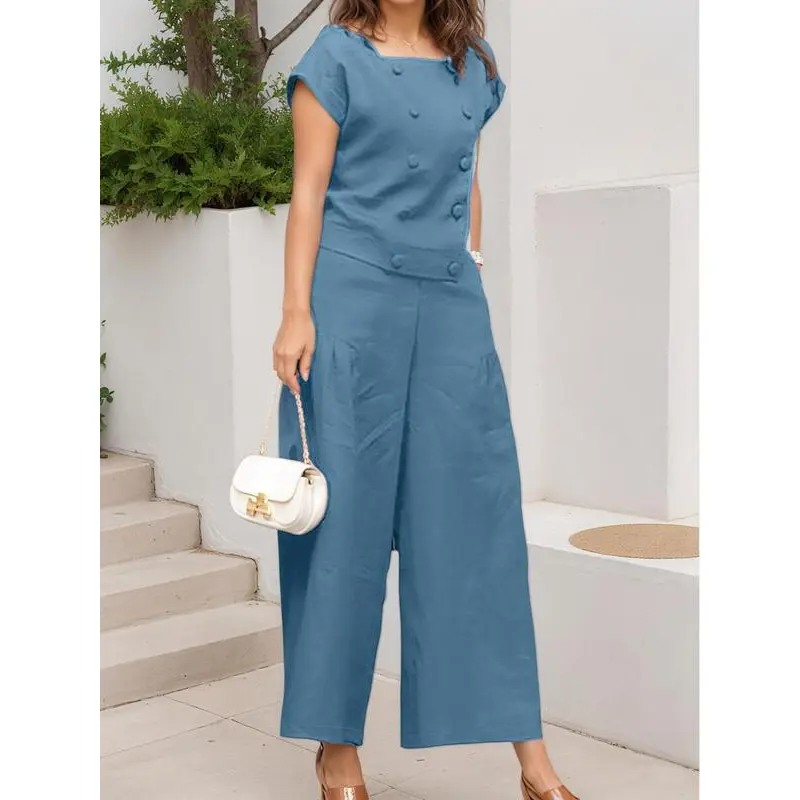 Women's Solid Button Front Top & Wide Leg Pants Two-piece Set, Casual Short Sleeve Top & Pants for Summer, 2 Piece Sets Women, Ladies Clothes for Daily Wear
