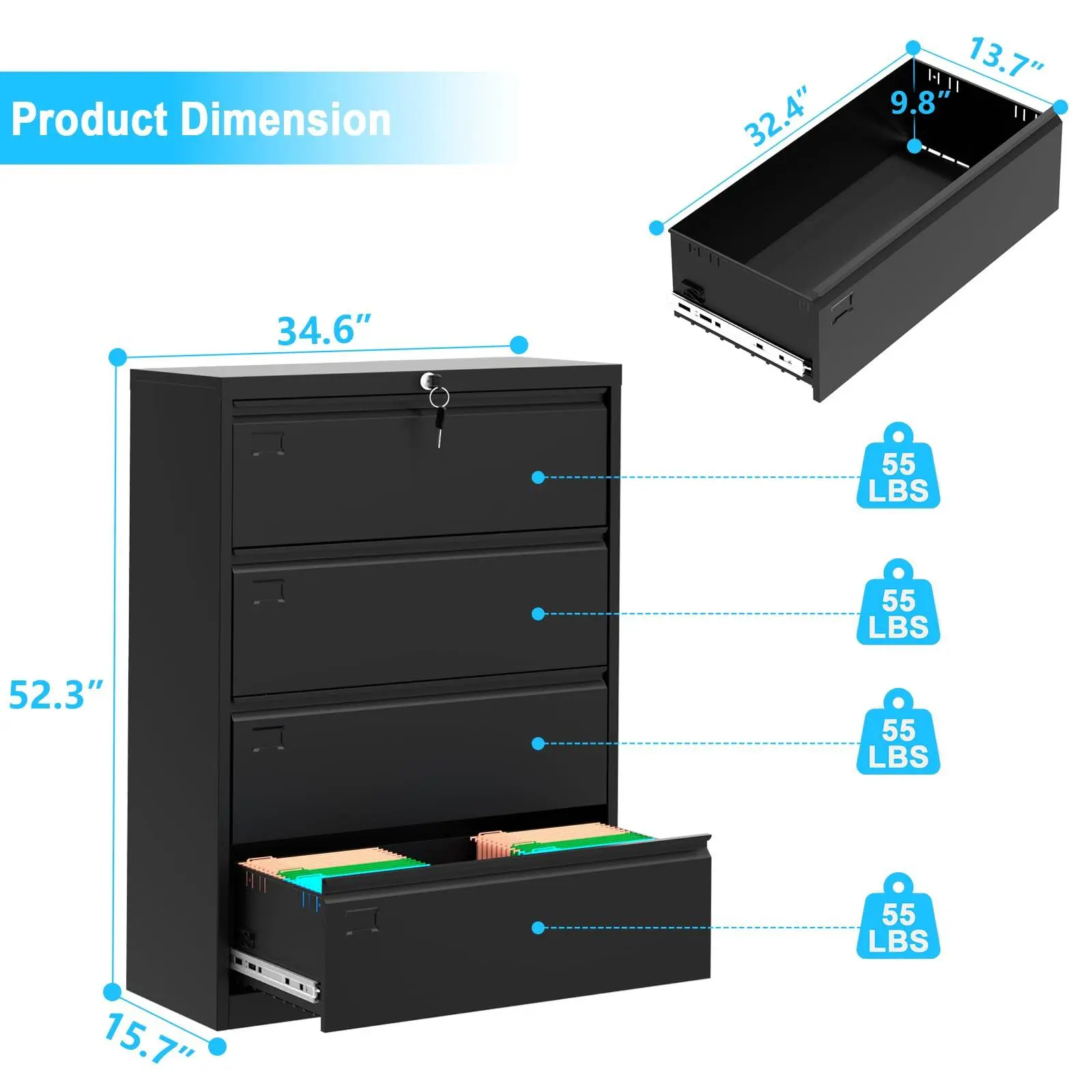 52inch High 4 Drawer Metal Lateral Filing Cabinet - File Cabinets, Lockable Storage, Organizes Hanging Files (Letter/Legal/F4/A4 Size), Requires Assembly