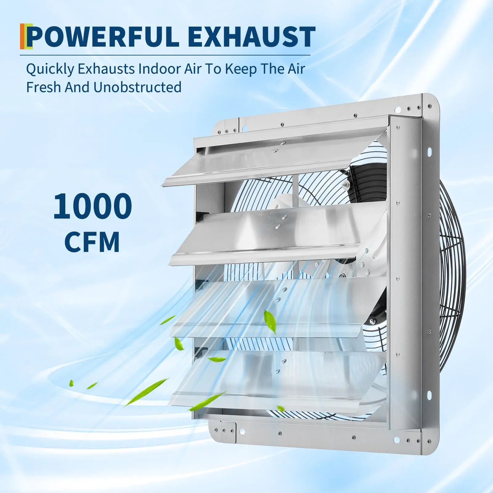 High Airflow Efficiency: This 12 inch shutter exhaust fan features a 35W motor and delivers a powerful 1000 CFM airflow at 1500 RPM, providing fast ventilation and better air quality. Ideal wall mounted exhaust fan for garage, attic, greenhouse, or shed