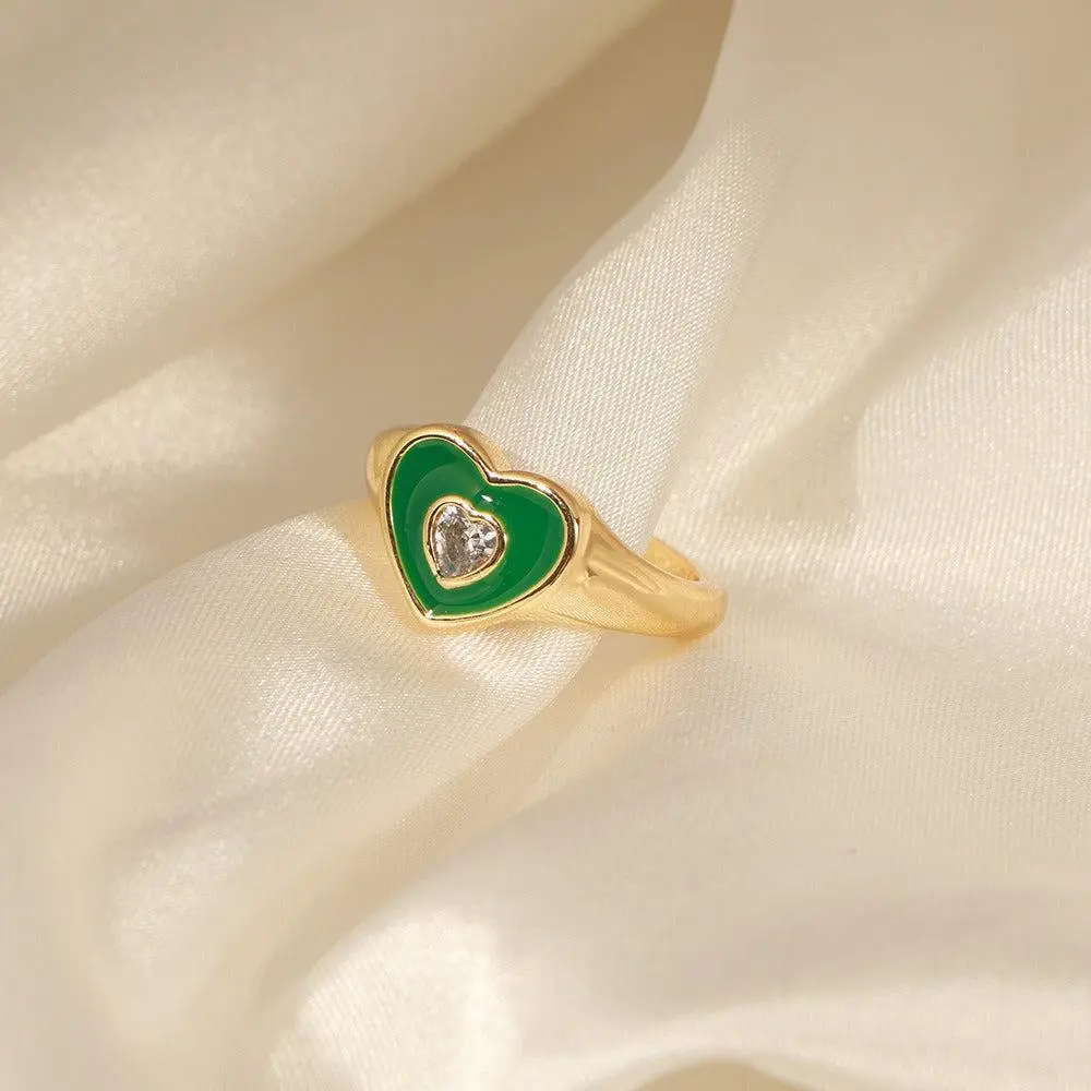 Heart Ring brings playful charm to your everyday stack with its sculpted heart silhouette and smooth enamel finish. The vibrant enamel surface is accented by a delicate crystal center, adding subtle sparkle and dimension. Sweet yet modern, this heart-shaped ring delivers a fresh pop of color while remaining easy to style and layer.