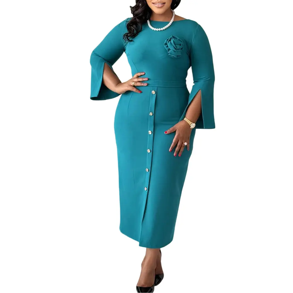Spring Summer Clothes Latest Trendy Women Elegant Classy Church Dresses Slit Sleeve African Dress Office Ladies Work Formal Events Gown with Flower