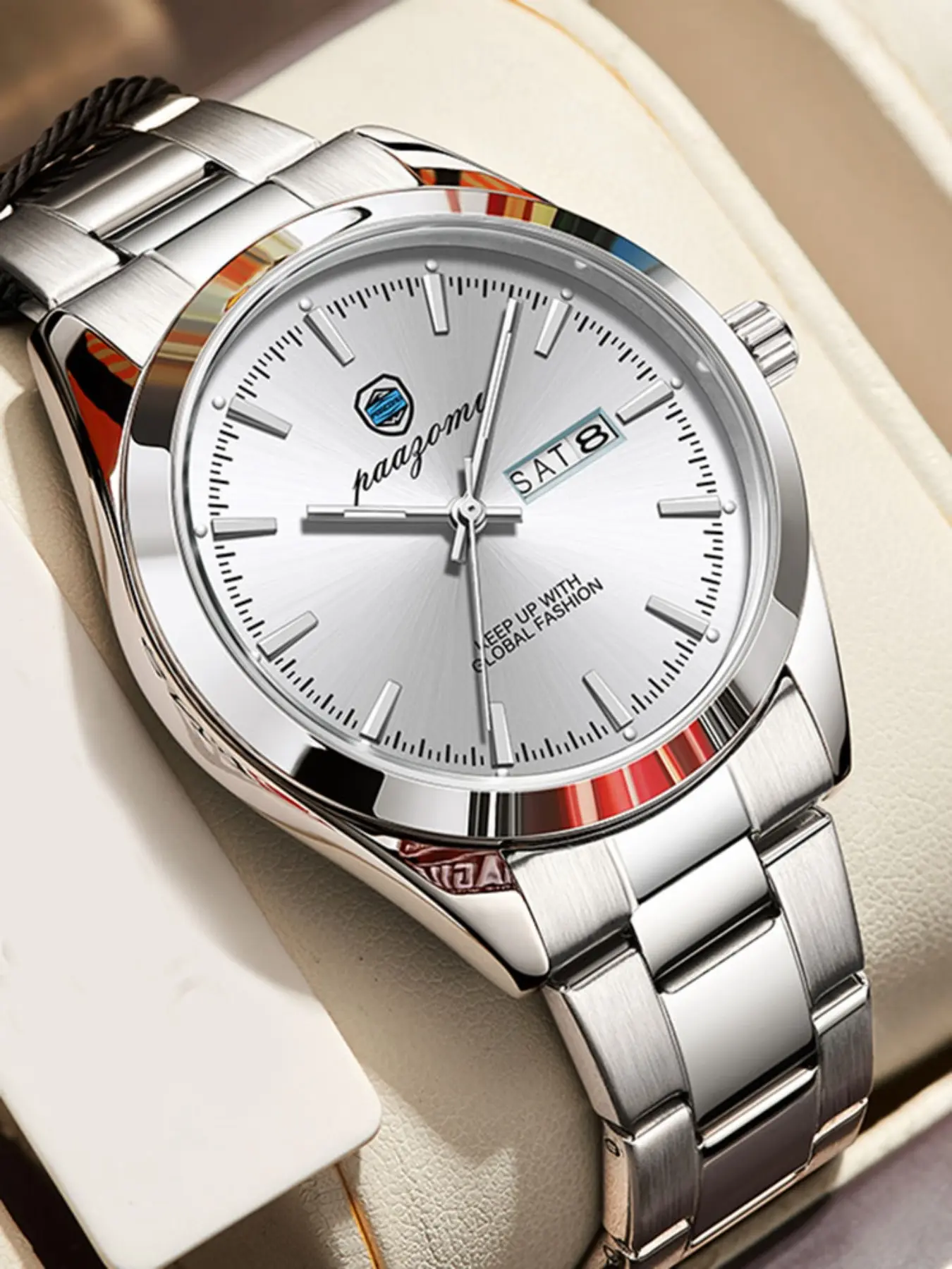 Paazomu 2026 Men's Watch, Original Quartz, Waterproof, Luminous, Stainless Steel, Automatic Date, with Box, Fashionable Design