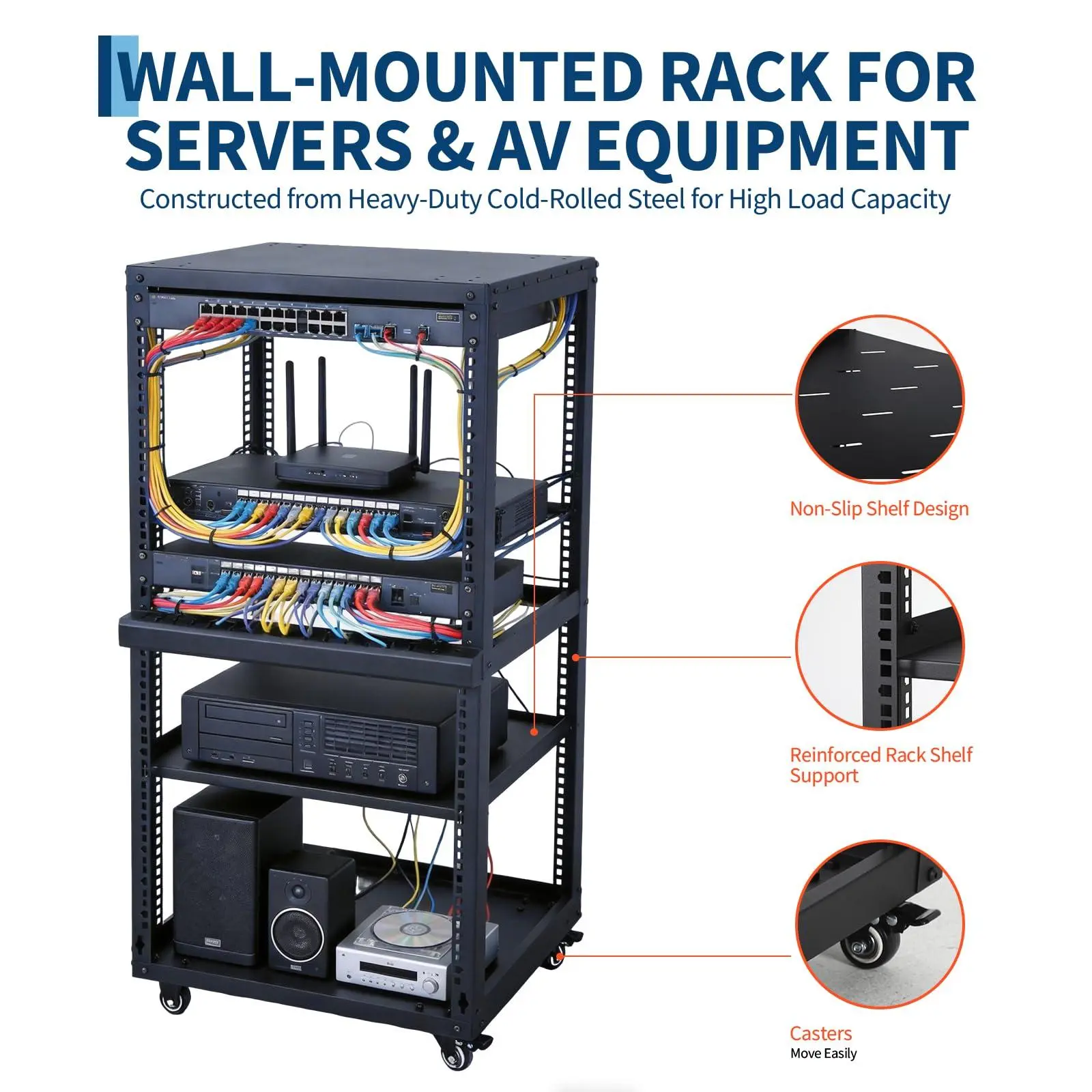 Practical & User-Friendly Structure: Features an ergonomic open frame with an additional top shelf for extra storage. Maximizes usable space and ensures convenient equipment installation, wiring, and daily maintenance. Equipped with smooth rolling    casters for easy mobility, allowing you to move the rack anywhere effortlessly.