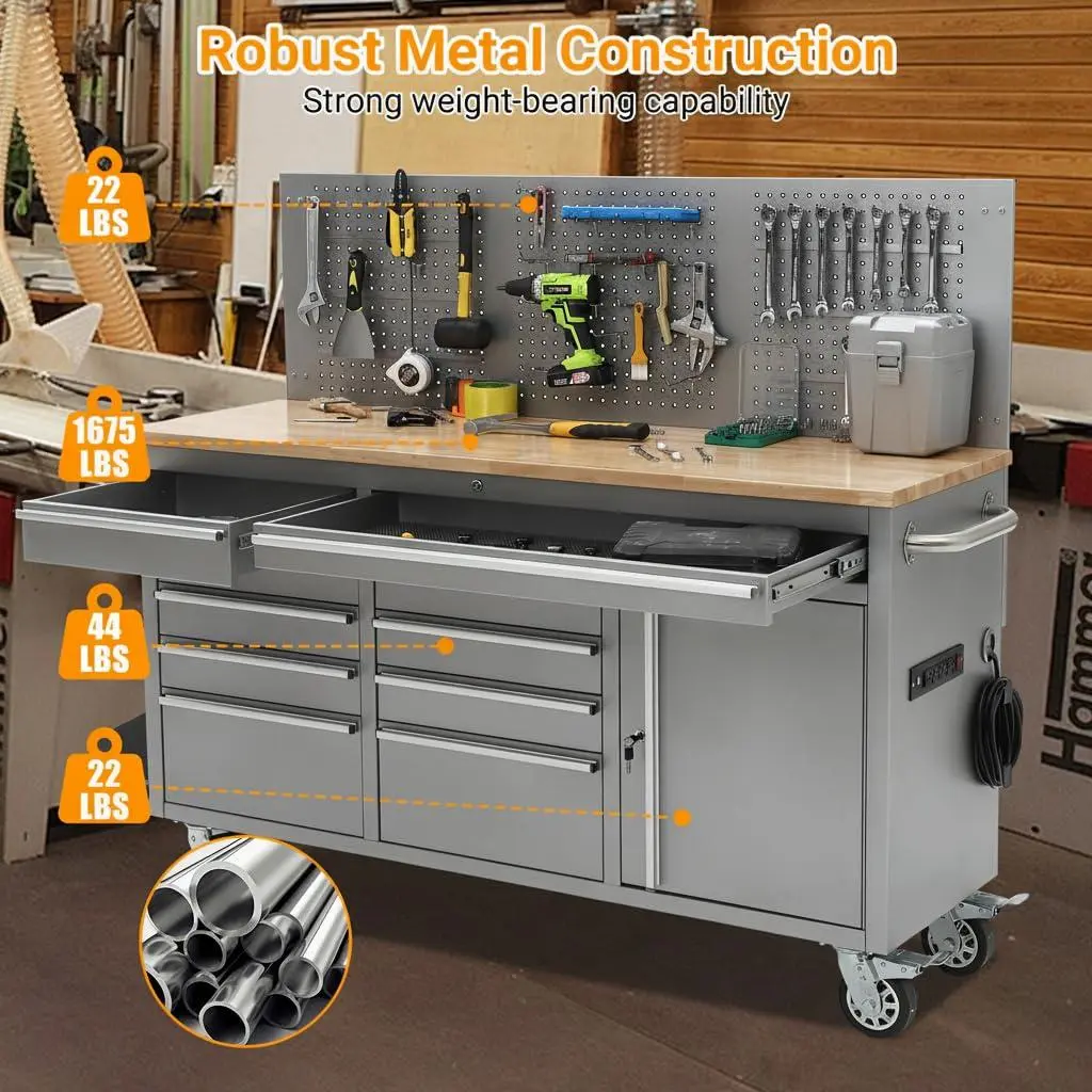 【Solid Rubber Wood Top】: Featuring a robust solid rubber wood top that serves as a solid and spacious workbench, this 61-inch rolling tool chest mobile workstation has a maximum load capacity of 1675 lbs. It includes a built-in power strip for convenient    tool operation and charging, making it perfect for heavy-duty tasks in garages, warehouses, and offices.