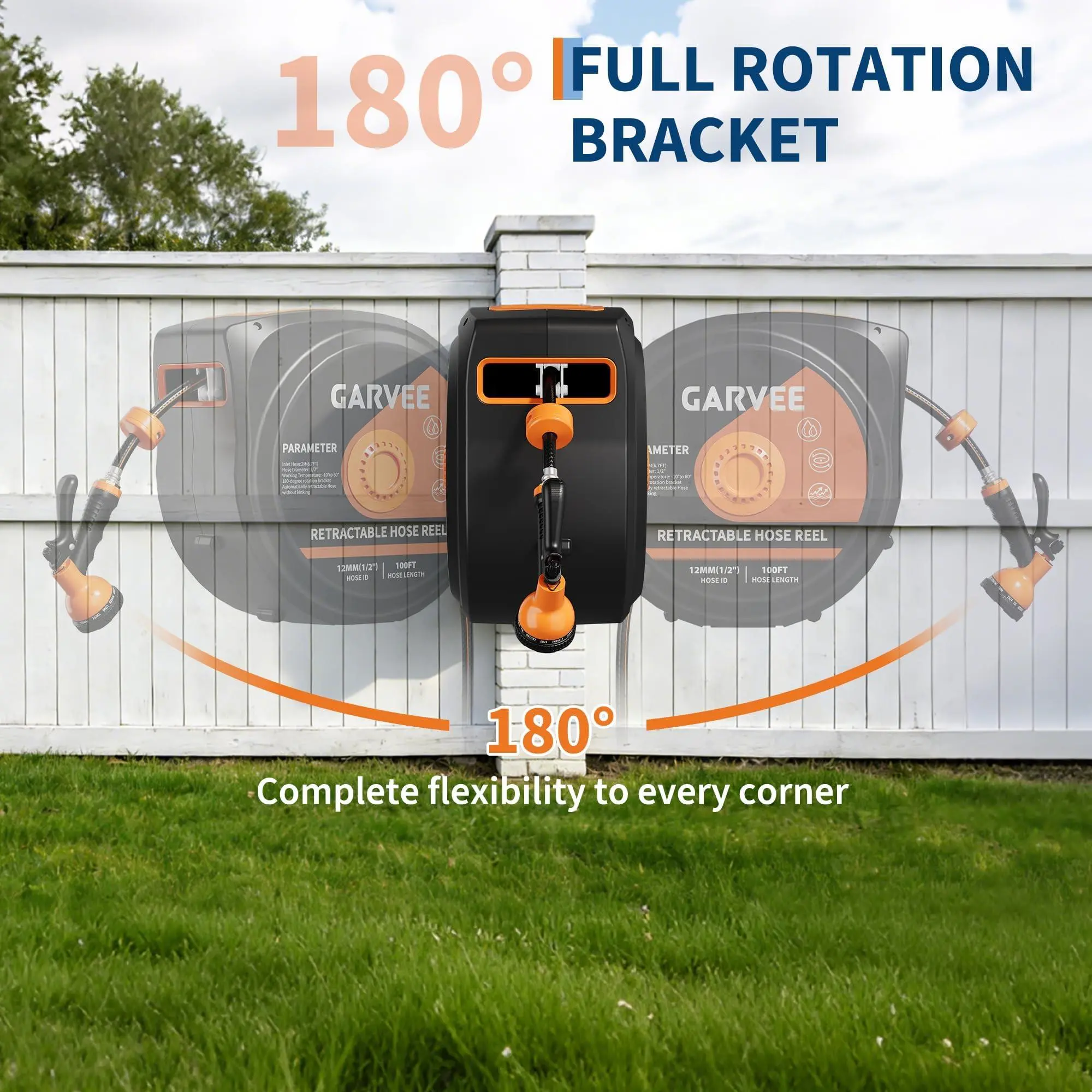 Effortlessly water your entire garden with a retractable hose reel featuring a 180° swivel base, ensuring wide coverage for lawns, patios, and large yards.