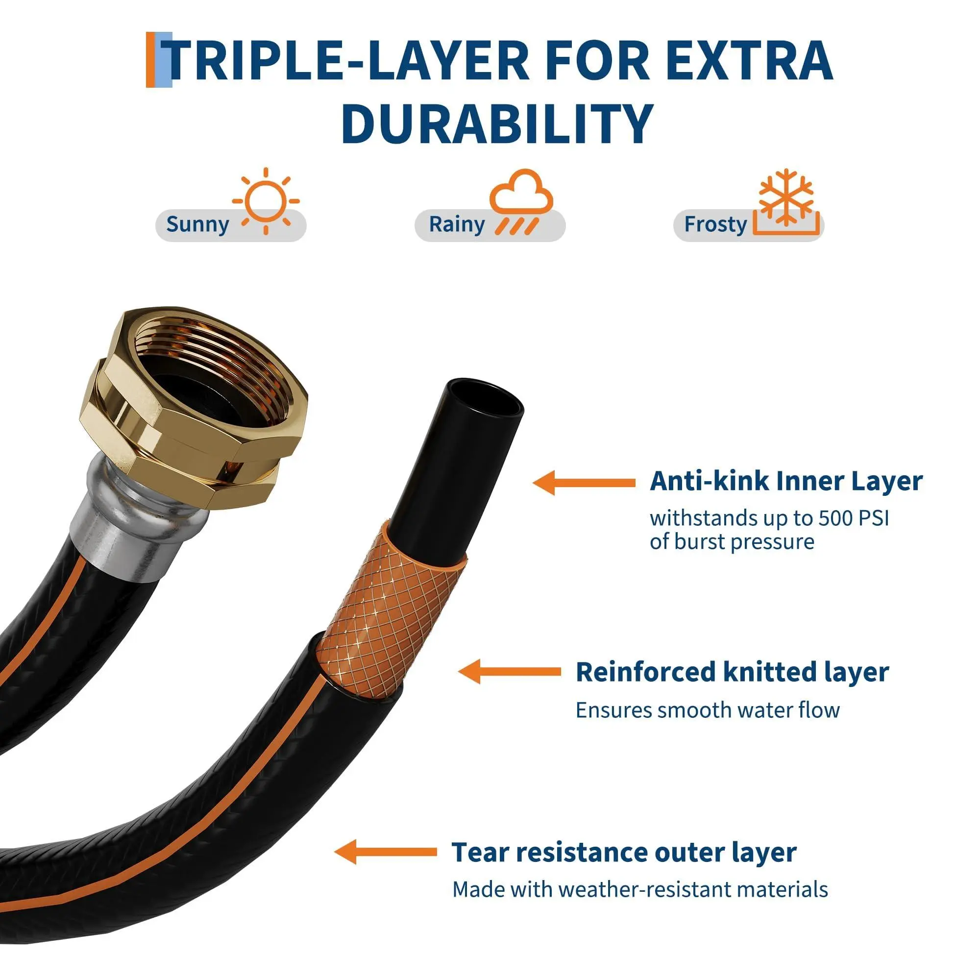 Durable, all-weather construction with UV-resistant and anti-freeze materials protects the hose reel from extreme temperatures and daily wear.