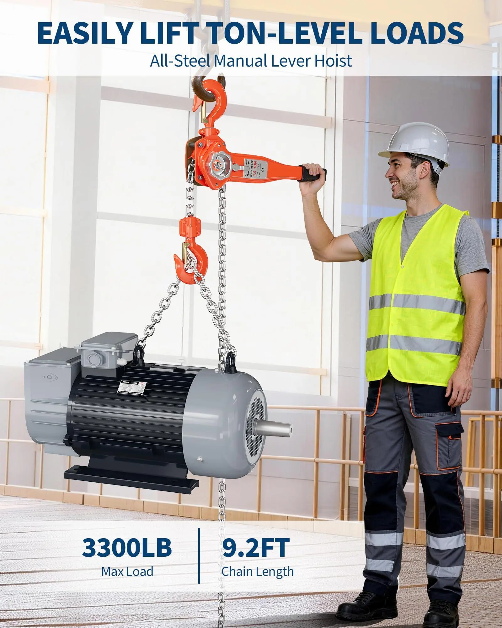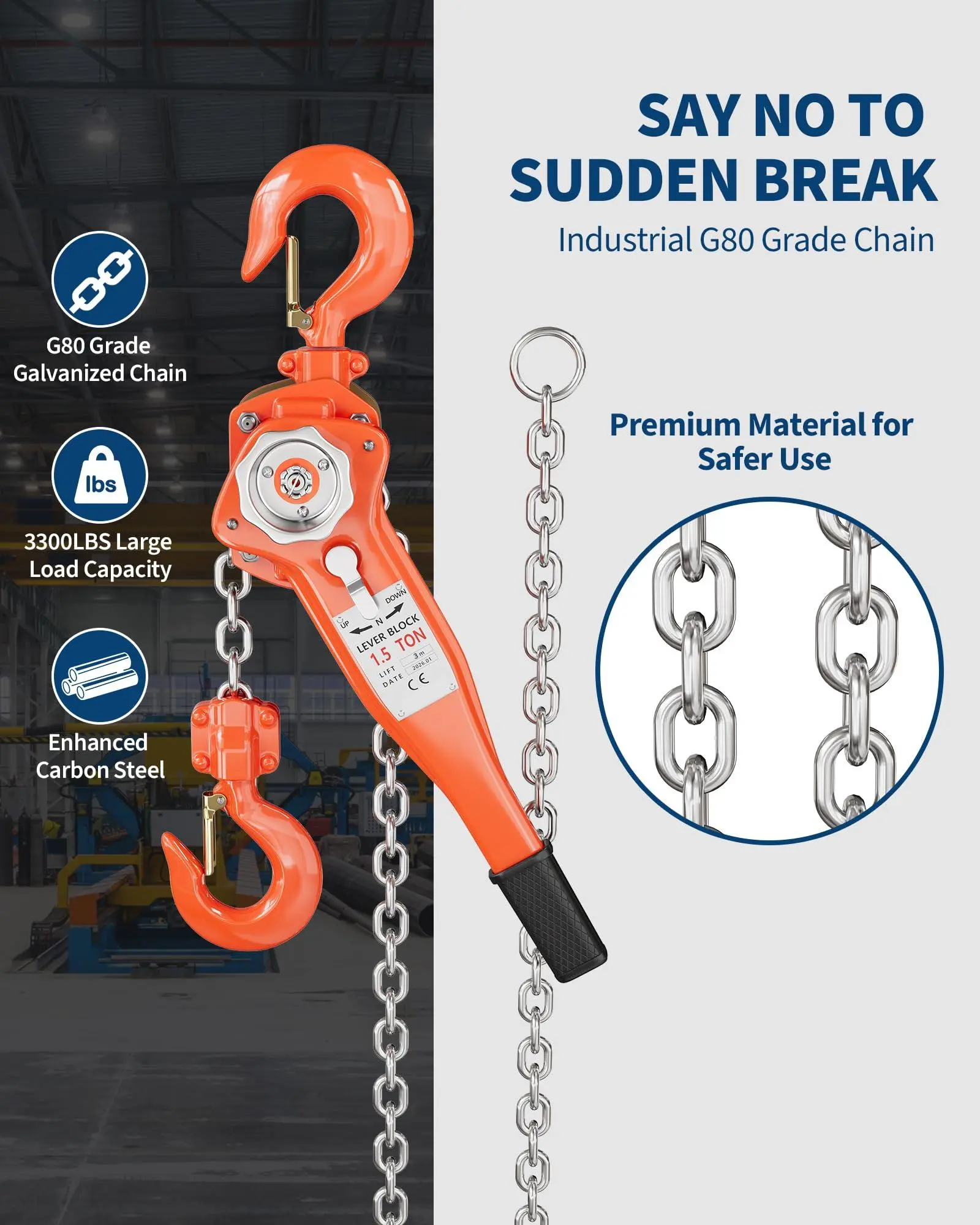 1-1/2 Ton Lifting Capacity: Tackle heavy-duty jobs with ease. Built from solid carbon steel, this hoist handles 3300 lbs / 1-1/2 Ton with exceptional impact and oxidation resistance. Its compact, lightweight design offers industrial strength in a portable package.