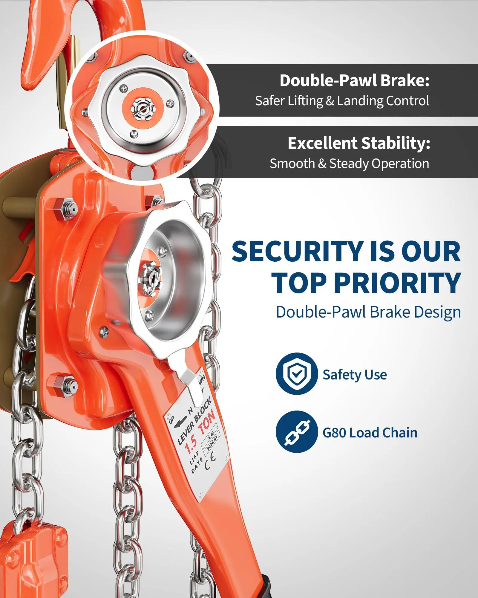 Double-Pawl Safety Brake: Engineered for total peace of mind. The advanced brake system evenly distributes load force, providing fail-safe braking even under heavy loads. Combined with 360° rotating alloy steel hooks that feature safety latches, you get precise load positioning and reliable hold every time.
