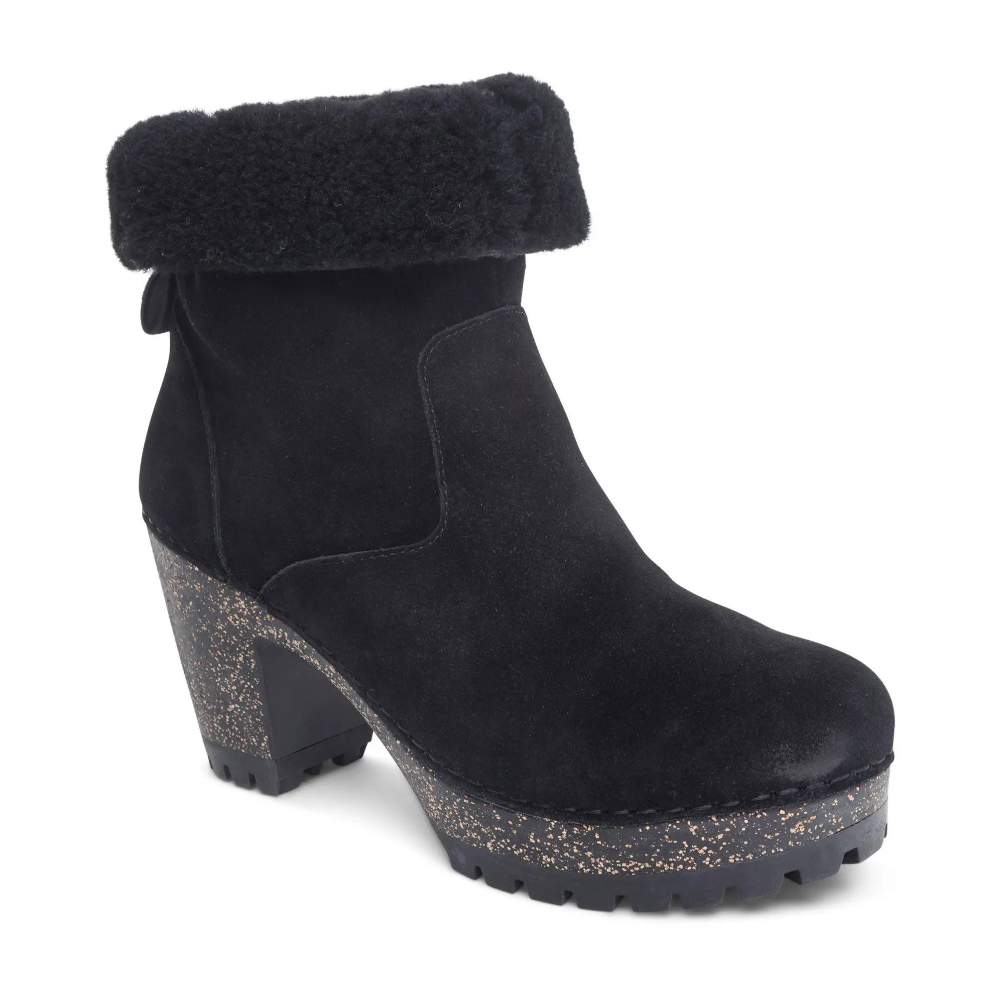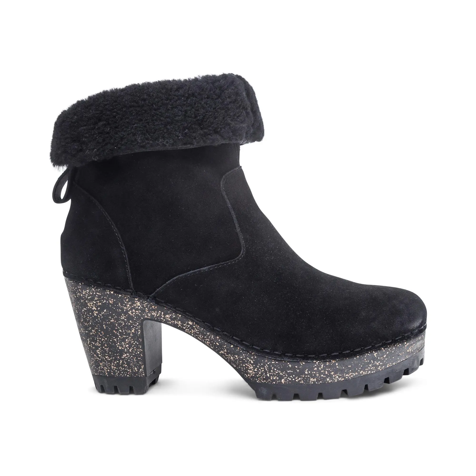 The Aetrex Orthotic System is Built-In to every pair: Arch support helps to stabilize and align feet Arch support helps to relieve common foot pain & plantar fasciitis The memory foam foot-bed provides cushioning & comfort Details: Adjustability: Pull tabs for easy on and off Upper Material: Weather-friendly genuine suede with shearling lining Midsole Material: Ultra-light cork Outsole Material: Rubber for durability Lug sole for added traction All materials treated to help protect against rain and puddles Removable Insole: No Heel Height: 3.25"
