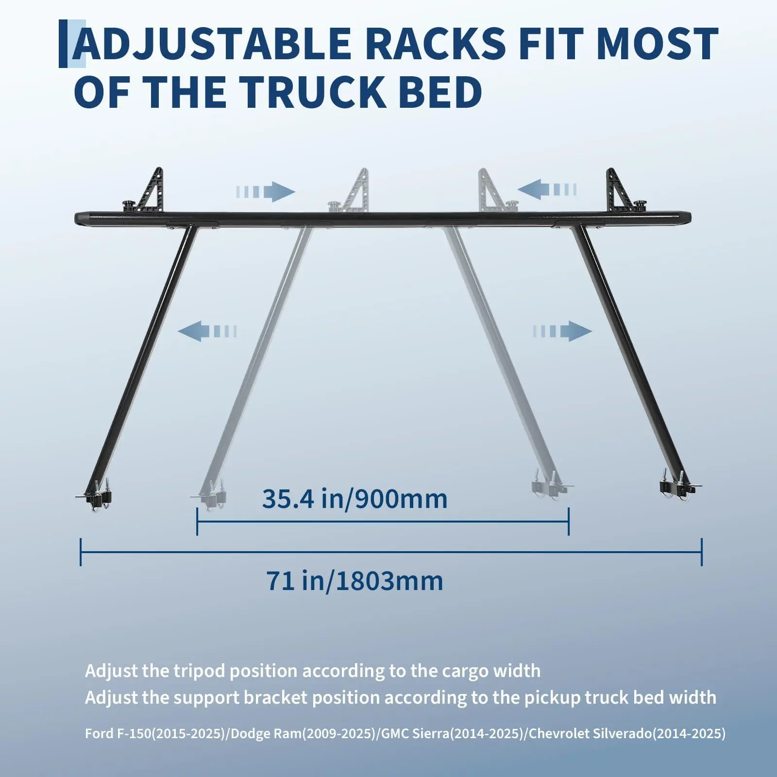 [Adjustable Width for Most Trucks] - Features an extendable width from 35.4" to 71", fitting popular models like Ford F-Series, Silverado, Tacoma, and RAM. Compatible with both short and long truck beds.