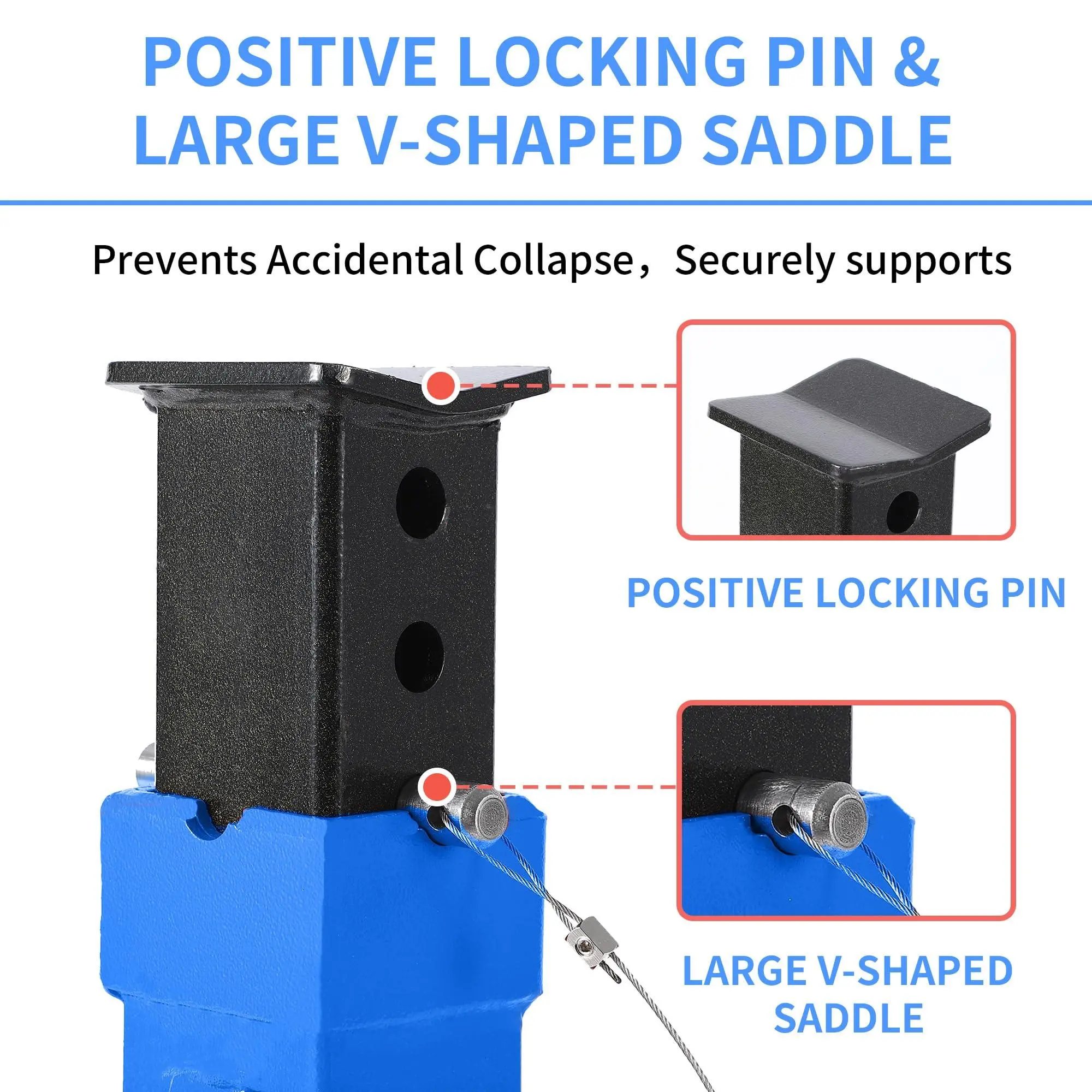 FAIL-SAFE DESIGN FOR TOTAL CONFIDENCE: Safety is paramount, and these pin-style supports are designed for complete peace of mind. The heavy-duty locking pin provides a positive, secure engagement you can trust. A wide, deep V-saddle cradles the vehicle's frame or axle securely, while the large steel base plates ensure a stable footprint that resists sinking into softer ground like asphalt.
