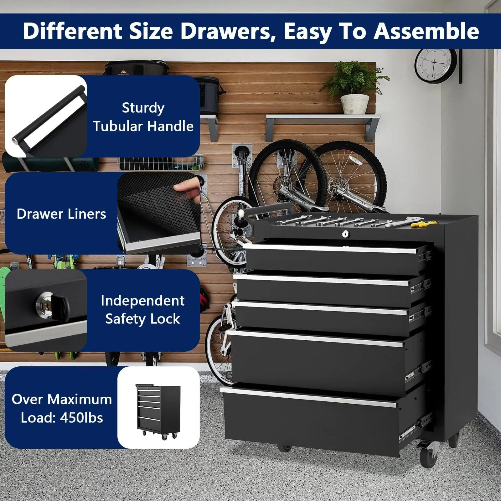 【Ample Organization】 The 5 spacious drawers and additional compartments in this tool box rolling tool cabinets offer extensive storage for all your tools. With designated spaces, this tool chest helps keep your workspace tidy and organized, allowing quick access and efficient workflow in your garage or workshop.