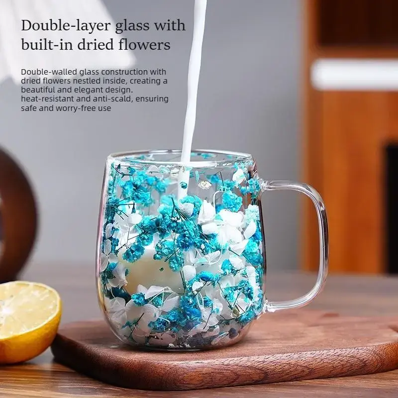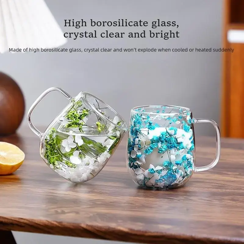 Double Glass Flower Tea Cup, 250ml Double Wall Glass Coffee Cup, Insulated Transparent Cup with Dried Flowers, Heat Resistant Drinkware Tumbler, New Year Gift.The top choice for Mothers Day Gift