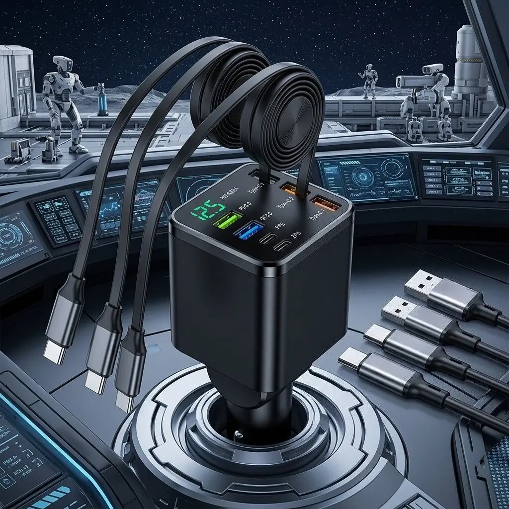 2026 Retractable Car Charger 7 in 1 Fast Charging Car Charger Retractable Cable USB Type C Multi Ports 5-in-1 smart Car Charger Adapter Compatible