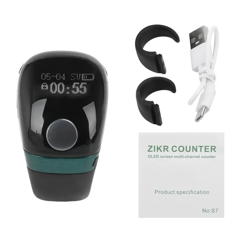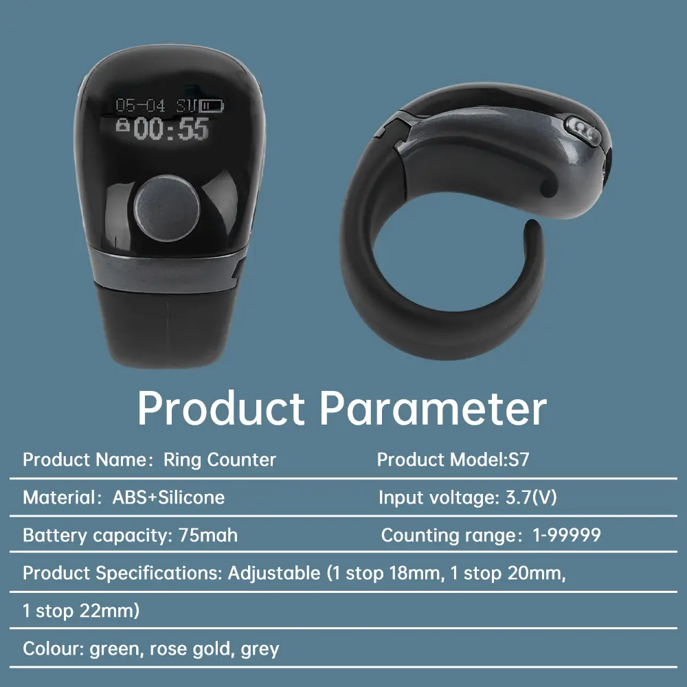 Features: 1.Portable counter precision buttons, accurate counting, and long button lifespan. 2.Equipped with self-locking function to avoid data loss caused by misoperation. 3.Oled display screen, displaying battery level, time, date, and count. 4.Type-c charging, long-lasting battery life, built-in 75mah rechargeable battery. 5.The ring has three adjustable gears, which is convenient and practical.
