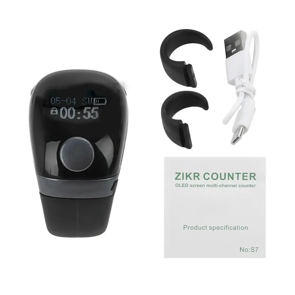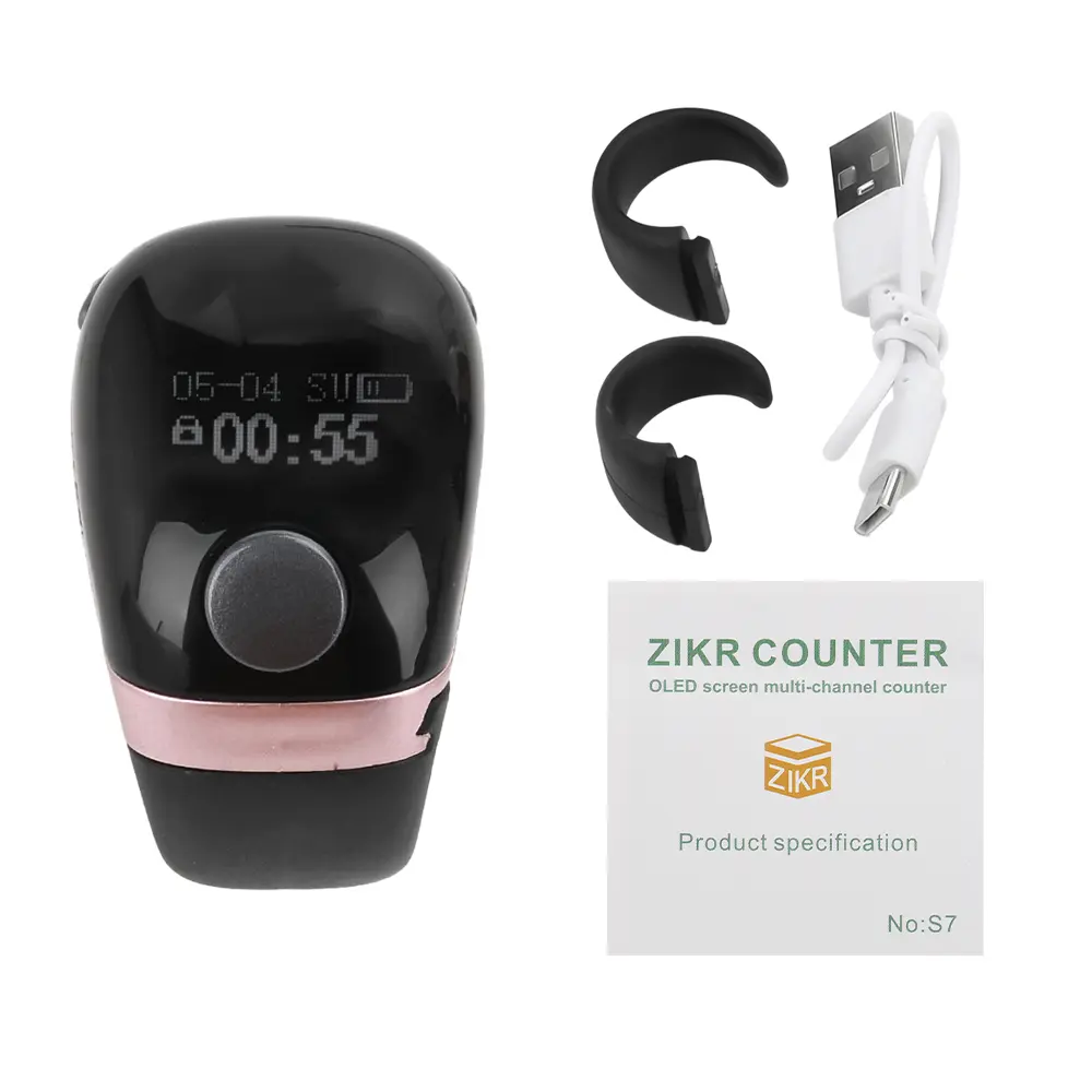 Features: 1.Portable counter precision buttons, accurate counting, and long button lifespan. 2.Equipped with self-locking function to avoid data loss caused by misoperation. 3.Oled display screen, displaying battery level, time, date, and count. 4.Type-c charging, long-lasting battery life, built-in 75mah rechargeable battery. 5.The ring has three adjustable gears, which is convenient and practical.