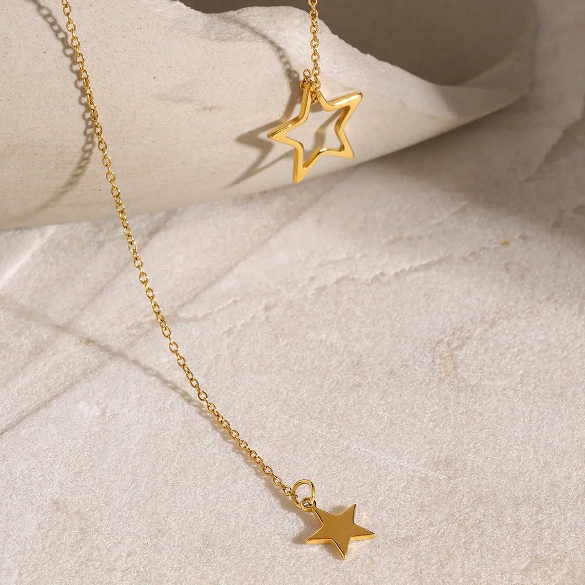Dangling Star 18K Gold PVD Necklace with Twin Star Charms Hypoallergenic Waterproof & Tarnish Resistant Celestial Magic Jewelry