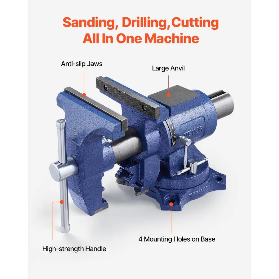 Crafted with quality ductile cast iron, 360 rotating head and base, our bench vise allows you to work from any angle. 6.5 jaw width, 5 jaw opening, and 3.11x 2.60 anvil for handling larger workpieces. Get a secure grip on round pipes and irregular shapes with pipe jaws and V-jaws.