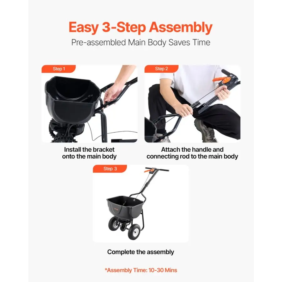 VEVOR Walk Behind Spreader, 60LBS Capacity, Push Spreader with Hopper Grate, 0-9.8 ft Spreading Width, 8 in All Terrain Pneumatic Tires, Garden Lawn Broadcast Spreaders, for Seed, FertilizerGranule RegulatorSpreading Width 0-9.8ftNever Flat TiresEffortless Lawn CreationThoughtful DetailsSpread More, Refill LessColor Scheme: White hubs+ black components, Weight Capacity: 60 lbs (27.2 kg), Materials: Q195 steel+ PP plastic, Item Model Number: TC2135, Product Weight: 6.2 kg/ 13.67 lbs, Tires: 8 pneumatic wheels, Adjustable Settings: 18 positions, Product Dimensions: 450× 800× 750 mm/ 17.72× 31.50× 29.53 inches, Spreading Range: 0-3 m/ 0-9.8 ft